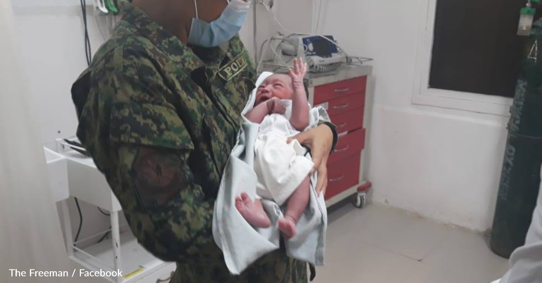 A newborn baby was found wrapped in a towel with his umbilical cord still hanging from the naval. The motorist, Junrell, carried the baby to the police station and got some assistance.