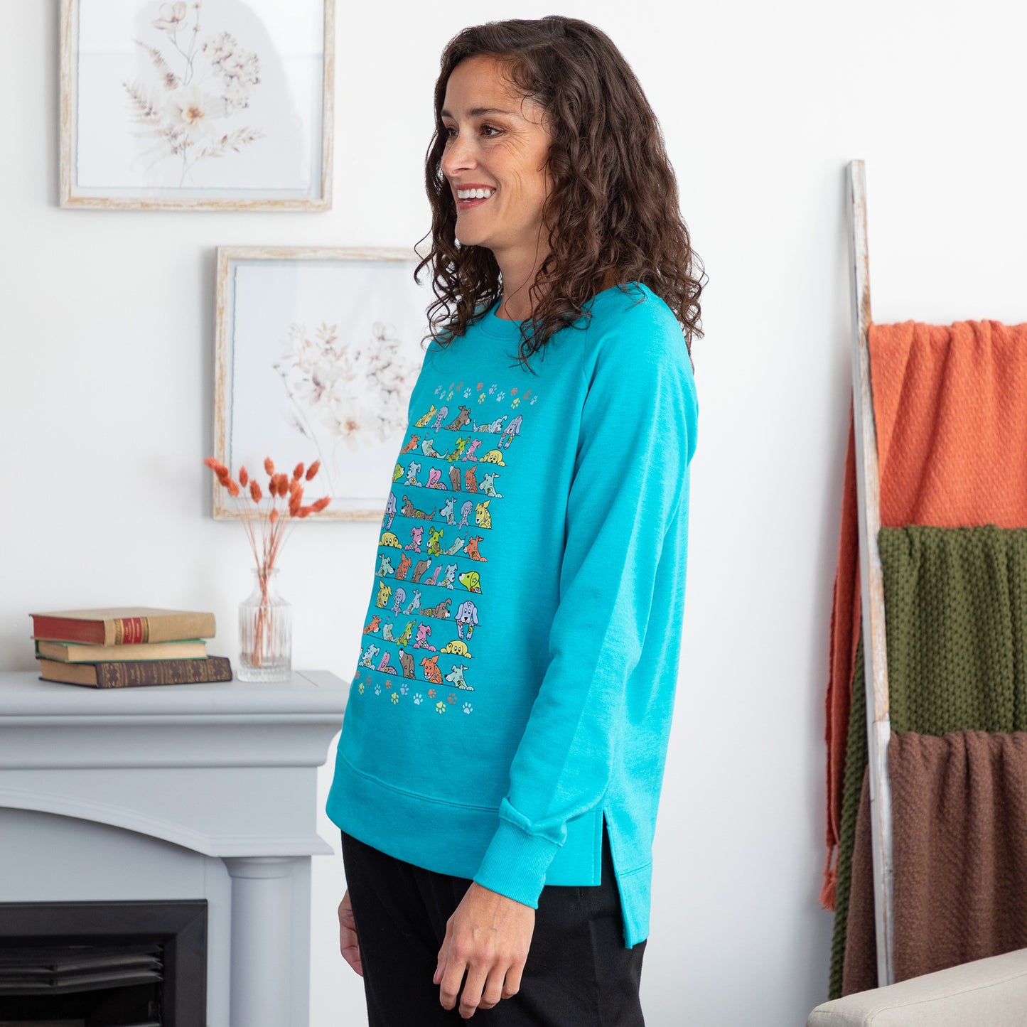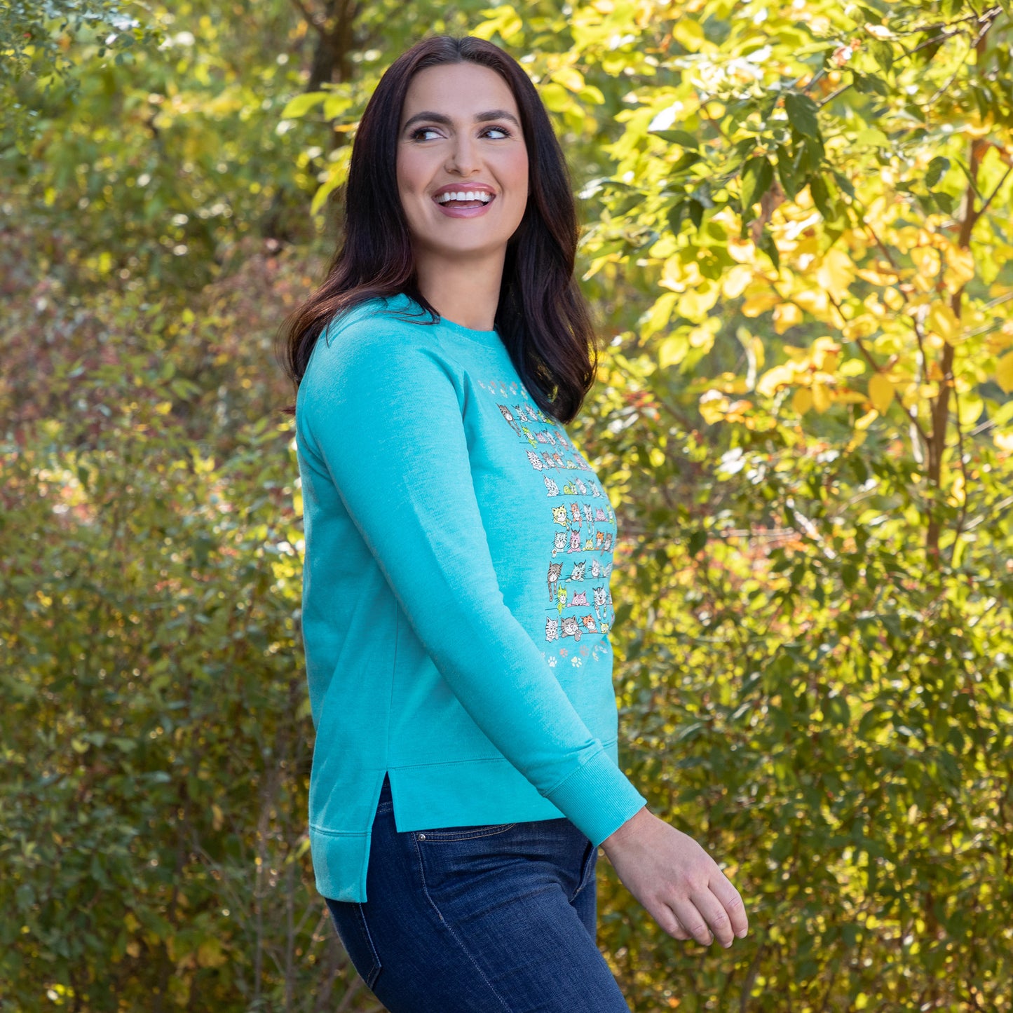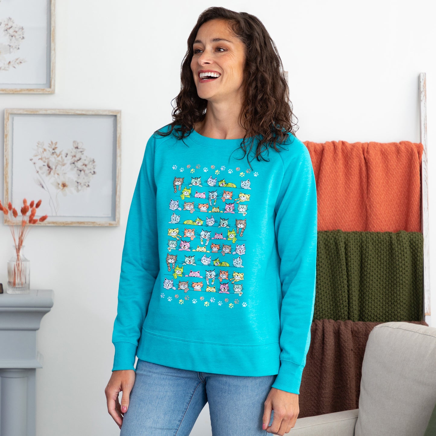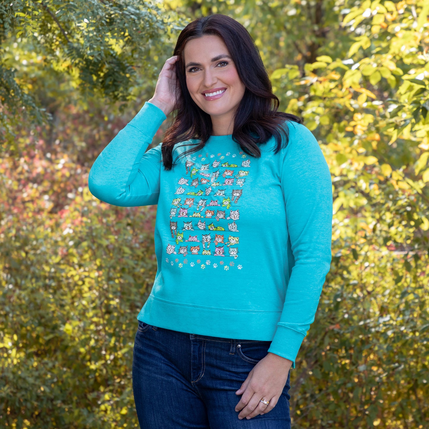 This sweatshirt is beautiful! Love the turquoise color and all the beautiful cat faces! I have 2 rescue cats and am feeding 4 community cats. Of course those 4 stay close by cuz they get plenty to eat!