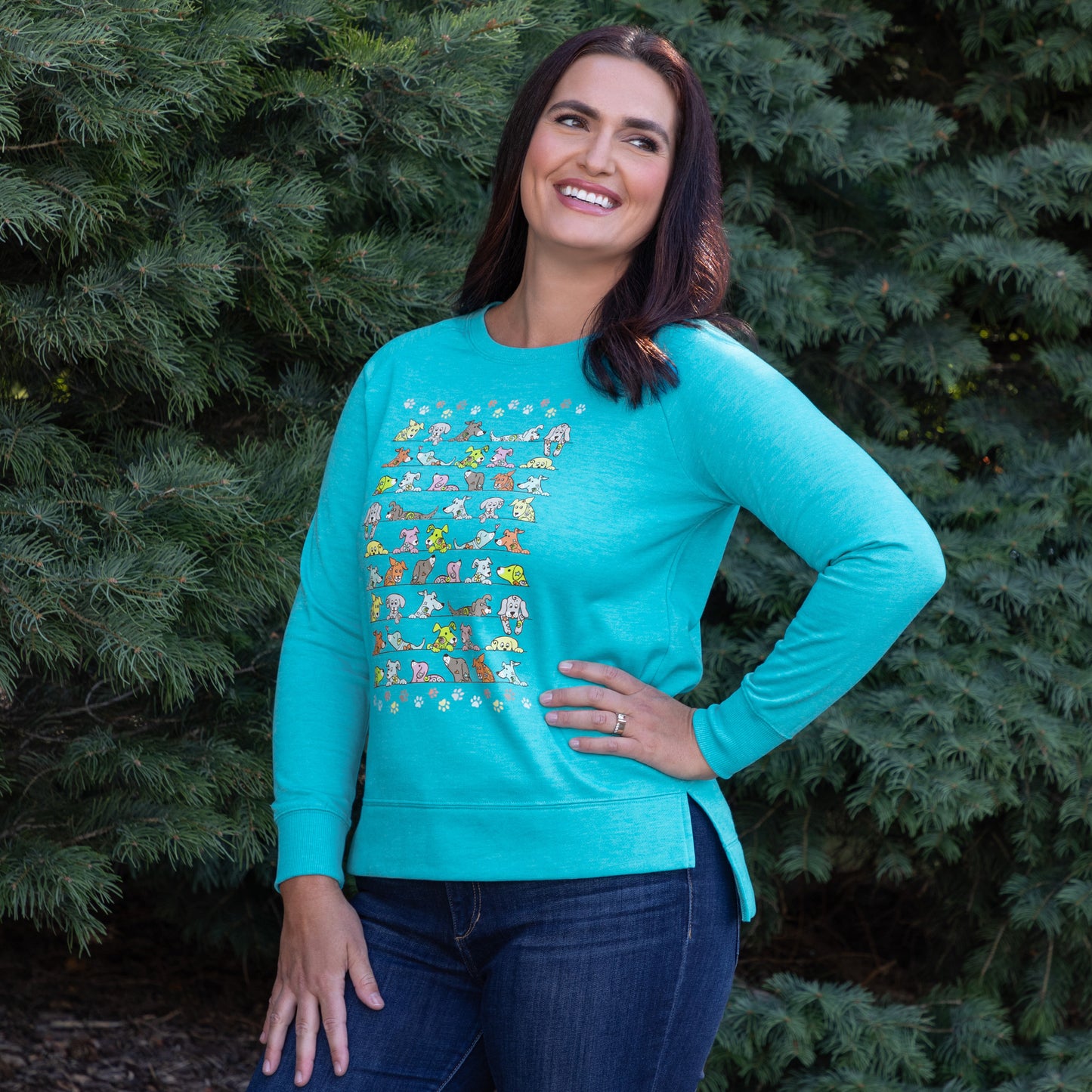 This crewneck sweatshirt is a delightful combination of animal love, cuteness, and coziness. It's designed to capture attention and keep you comfy. With an adorable drop tail, it has a longer back to add a modern touch and extra coverage. The front features a playful print of peeking cats or dogs, adding a sense of joy to the top. The classic crew neckline pairs well with the relaxed fit, making it perfect for lounging or casual outings.