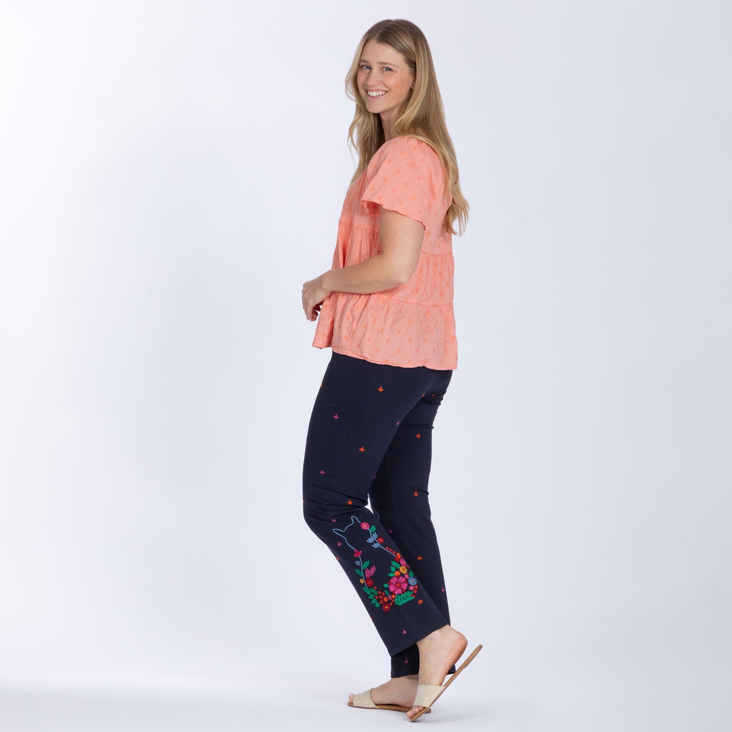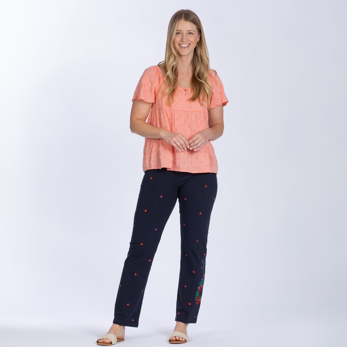 Comfortable and cute pants featuring a playful design and a flexible, flattering fit. Made with stretchy fabric for all-day comfort and perfect movement. Featuring intricate embroidery throughout and a larger design running down to the bottom of the leg, these pants exude a one-of-a-kind charm. The elastic waistband ensures a snug fit and the soft fabric is gentle on the skin. Whether you're lounging or running errands, these pants will make you look adorable and feel at ease.
