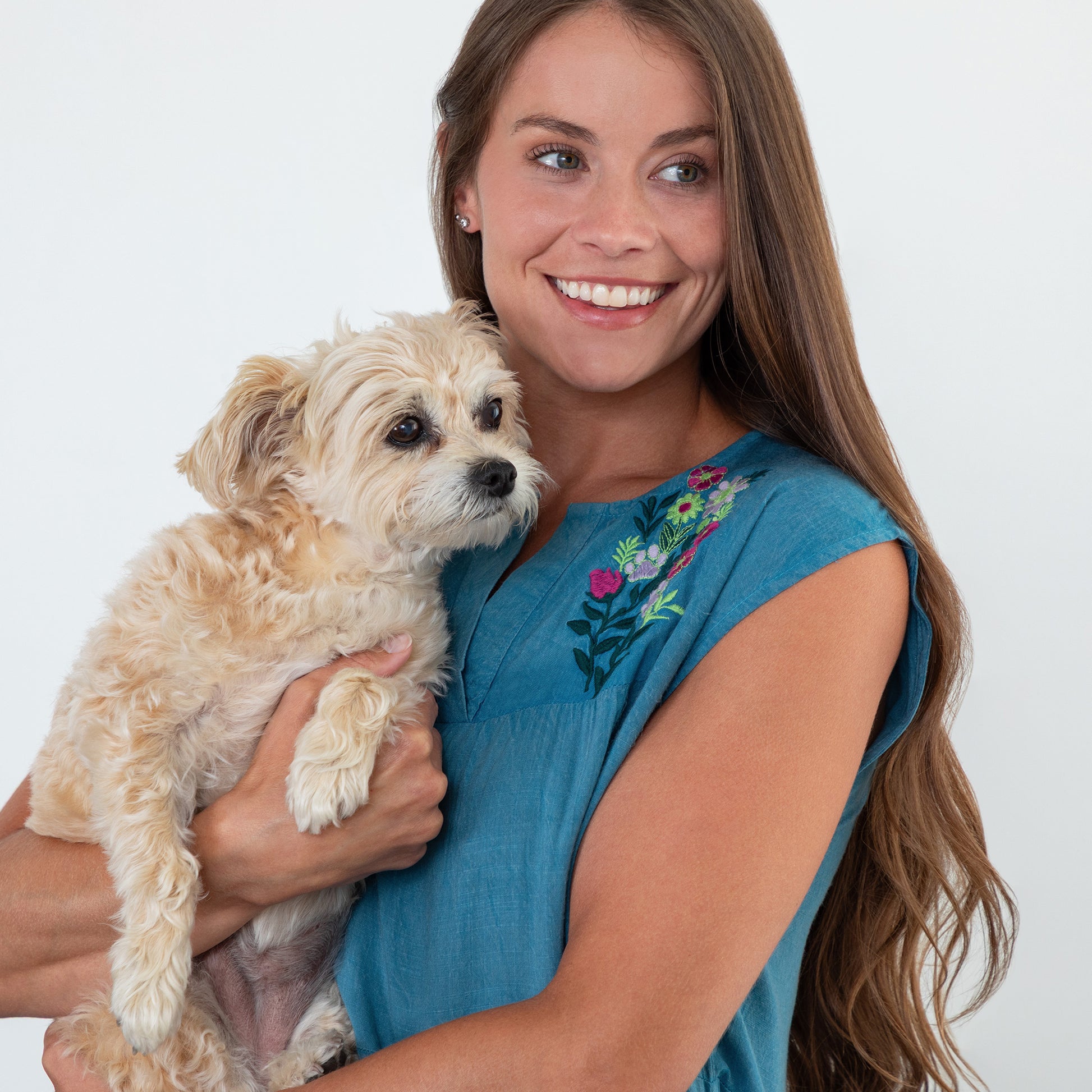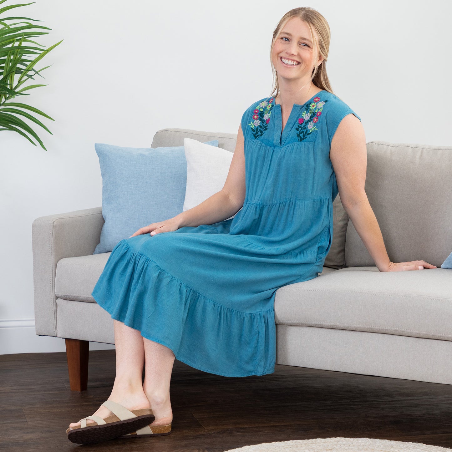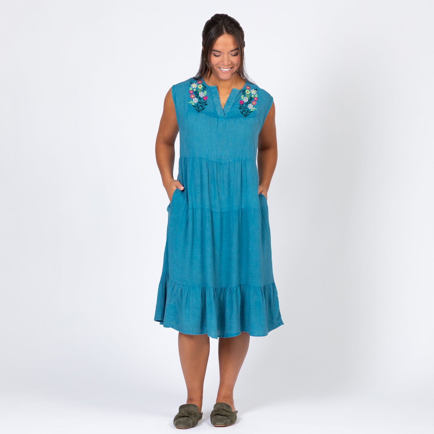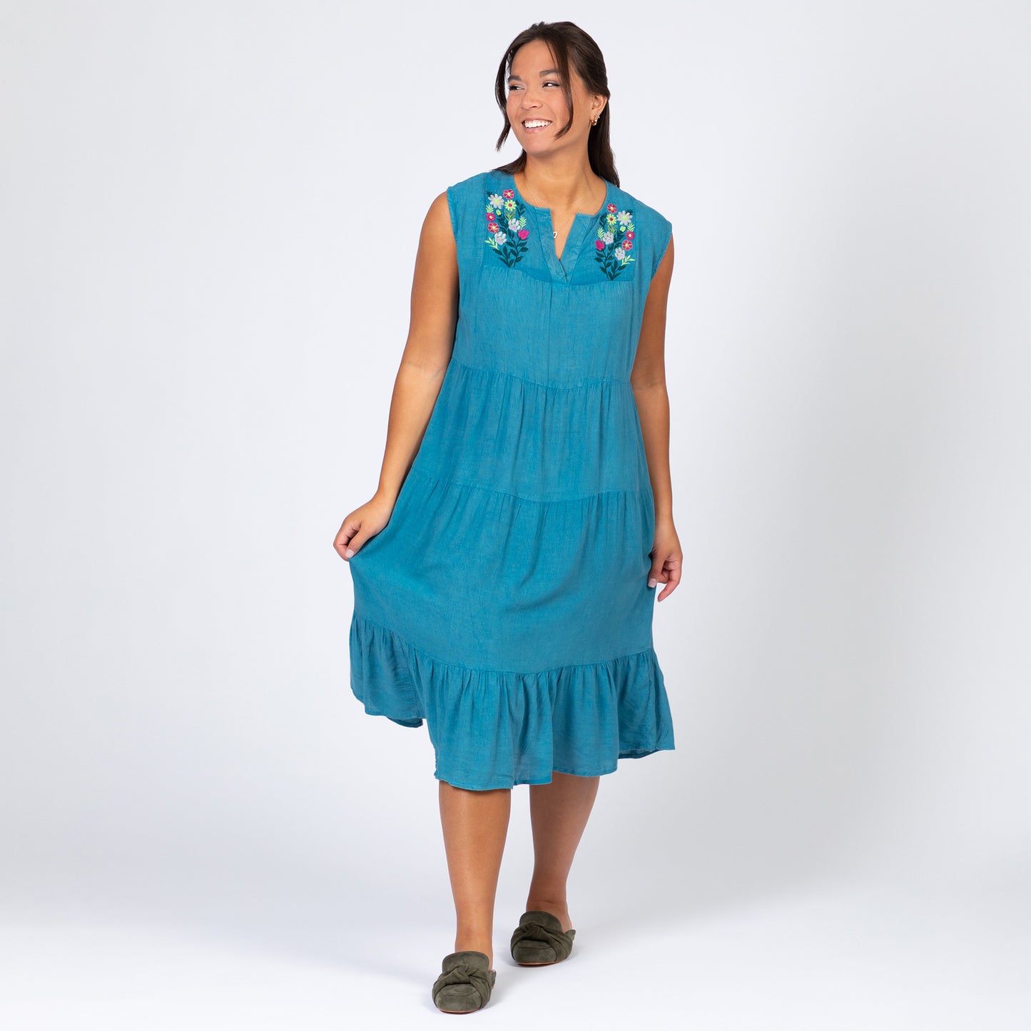 Effortlessly stylish and endlessly comfortable, this stonewashed tiered sleeveless dress is your go-to for casual days with a touch of charm. Detailed embroidery featuring flowers and paw prints adorns the front yoke, adding a unique and heartfelt detail. With a flowy midi-length silhouette, two handy side pockets, and breathable fabric made in India, this dress is perfect for warm days and relaxed elegance.