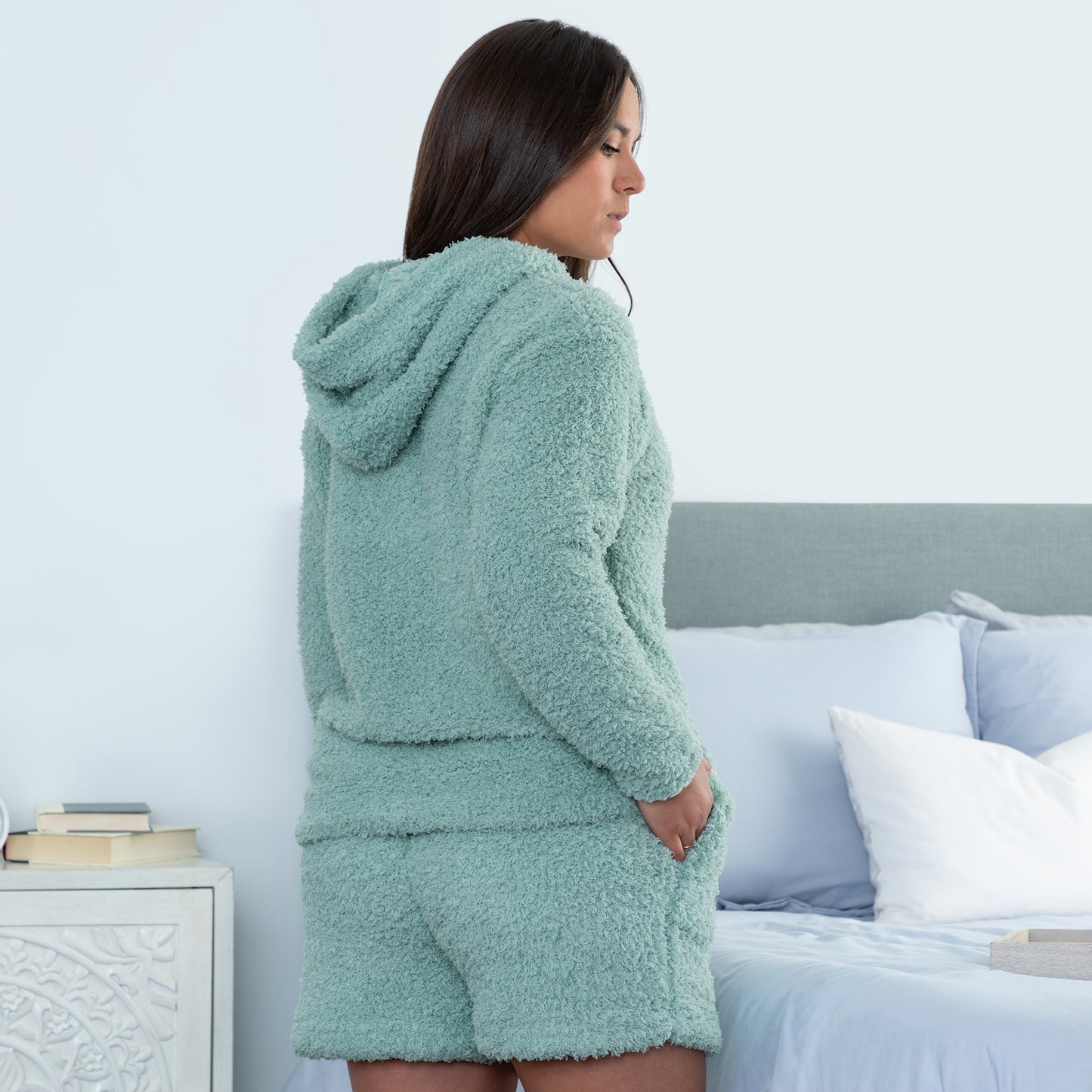 This cozy set mixes playful paw prints and a super soft fabric for the perfect blend of comfort and style. The hoodie has embroidered paw prints, a kangaroo pocket, and the shorts have a drawstring waist and pockets. It's the ultimate choice for those who like to be comfy and cute, ideal for a night in or a lazy weekend. Add it to your loungewear collection for a delightful touch to your relaxation.