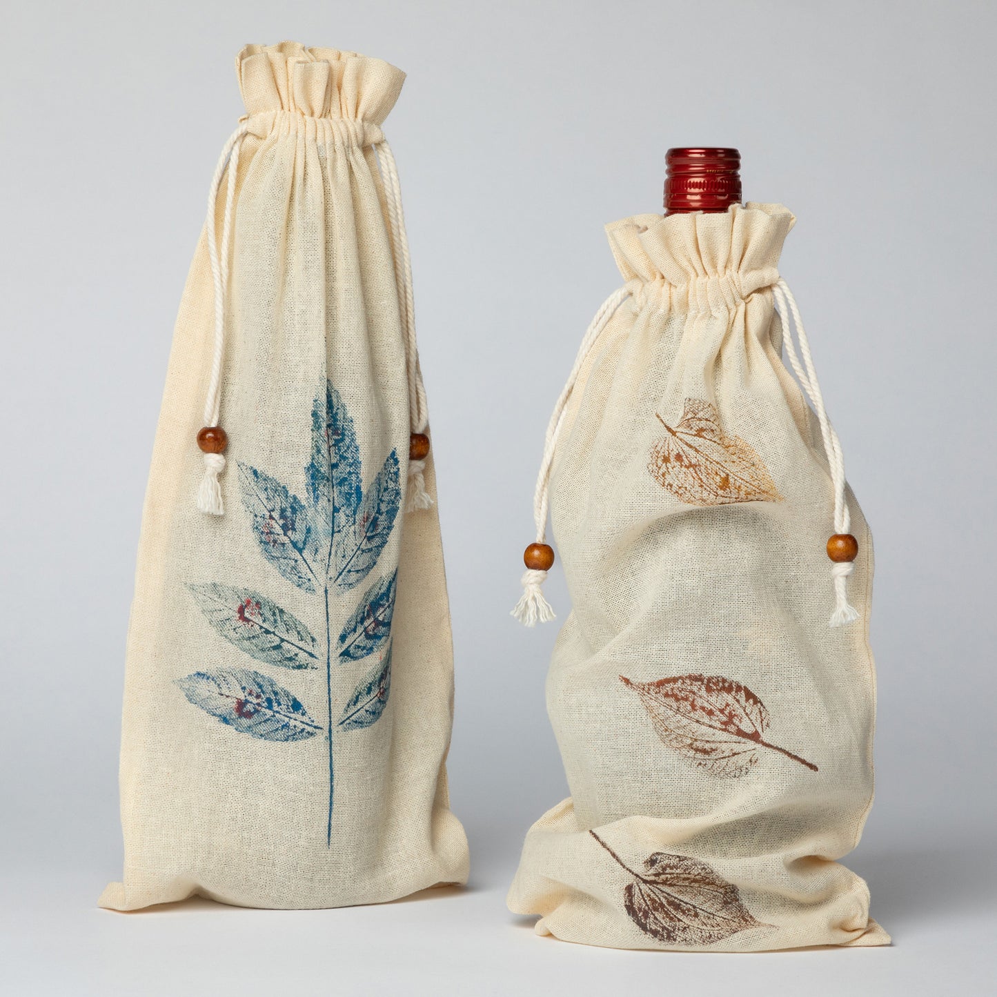 Add an eco-friendly, artisan-crafted touch to your gifting with a beautiful cotton wine bag duo. Each bag is handmade by skilled artisans in Thailand using 100% natural cotton, showcasing unique hand-printed leaf designs. Perfect for wine bottles or specialty gifts, these reusable bags are a sustainable and elegant way to celebrate while supporting fair trade practices.
