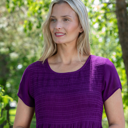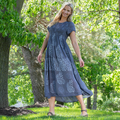 Breezy and effortlessly charming, this cap sleeve dress showcases a front-only, paisley-inspired print, thoughtfully handcrafted by skilled artisans in India through fair trade practices. Made from soft, lightweight rayon, it drapes with ease in a relaxed silhouette—perfect for sunlit days and spontaneous outings. Embroidered beading and detailing along the hem add an artful finish, making this globally inspired piece a beautiful fusion of comfort, character, and conscious craftsmanship.