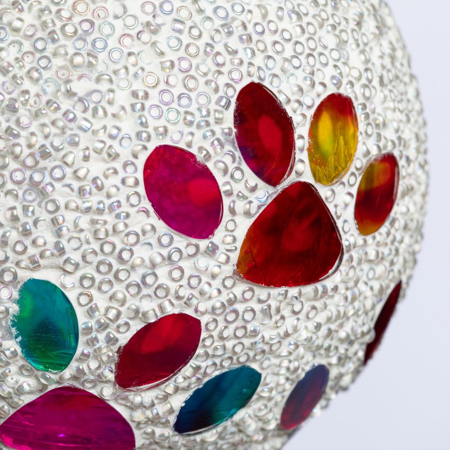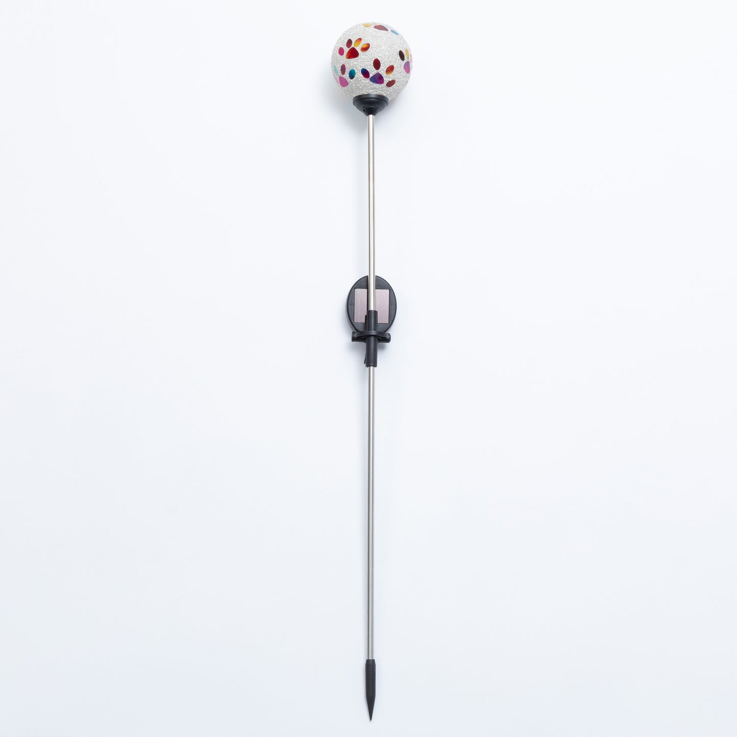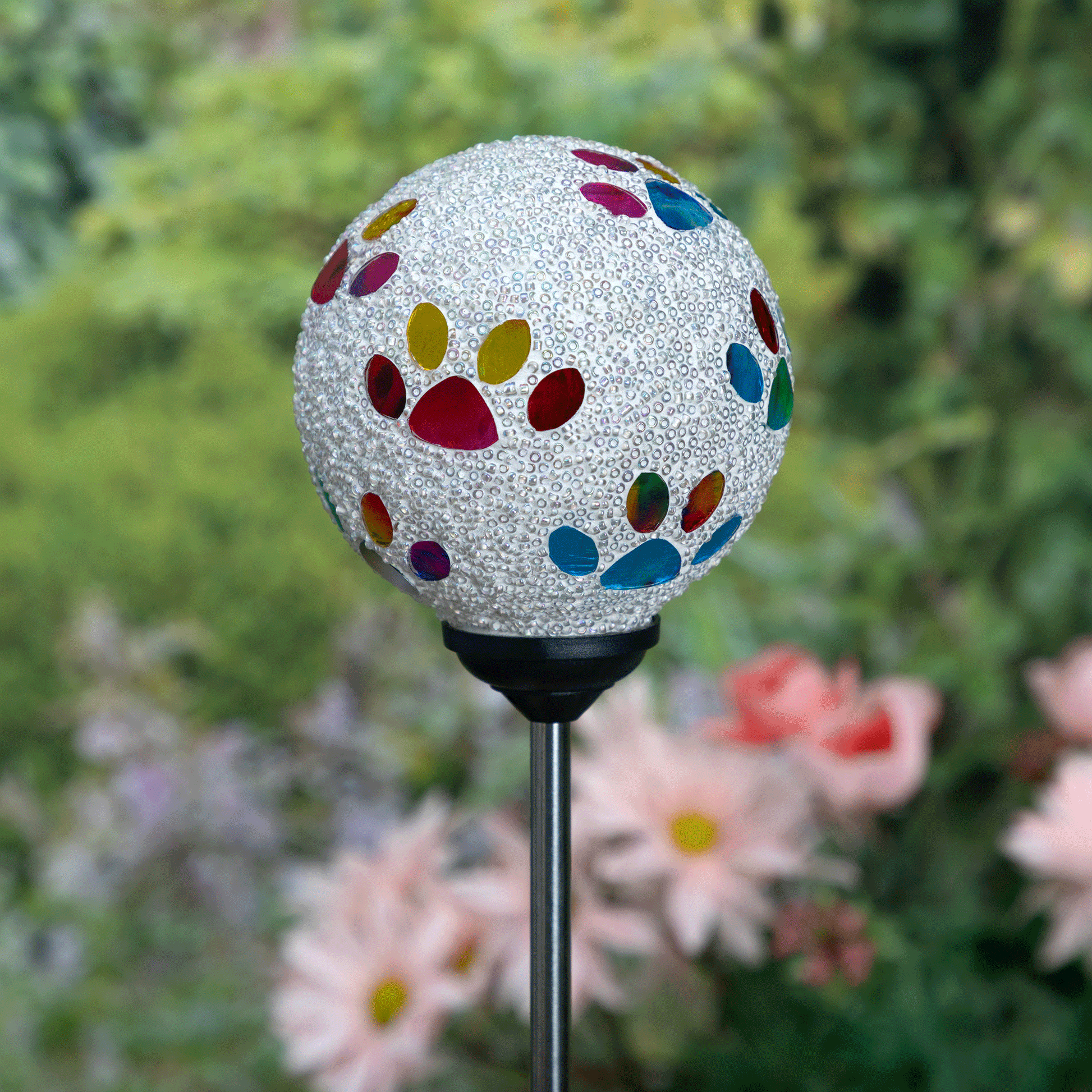 Bring a colorful glow to your garden with a solar-powered mosaic paw print garden stake! The beaded glass ball on top sparkles with multicolored paw prints, creating a playful and colorful display day or night. Powered by the sun, they add a charming, pet-loving touch to any outdoor space—no wiring needed!