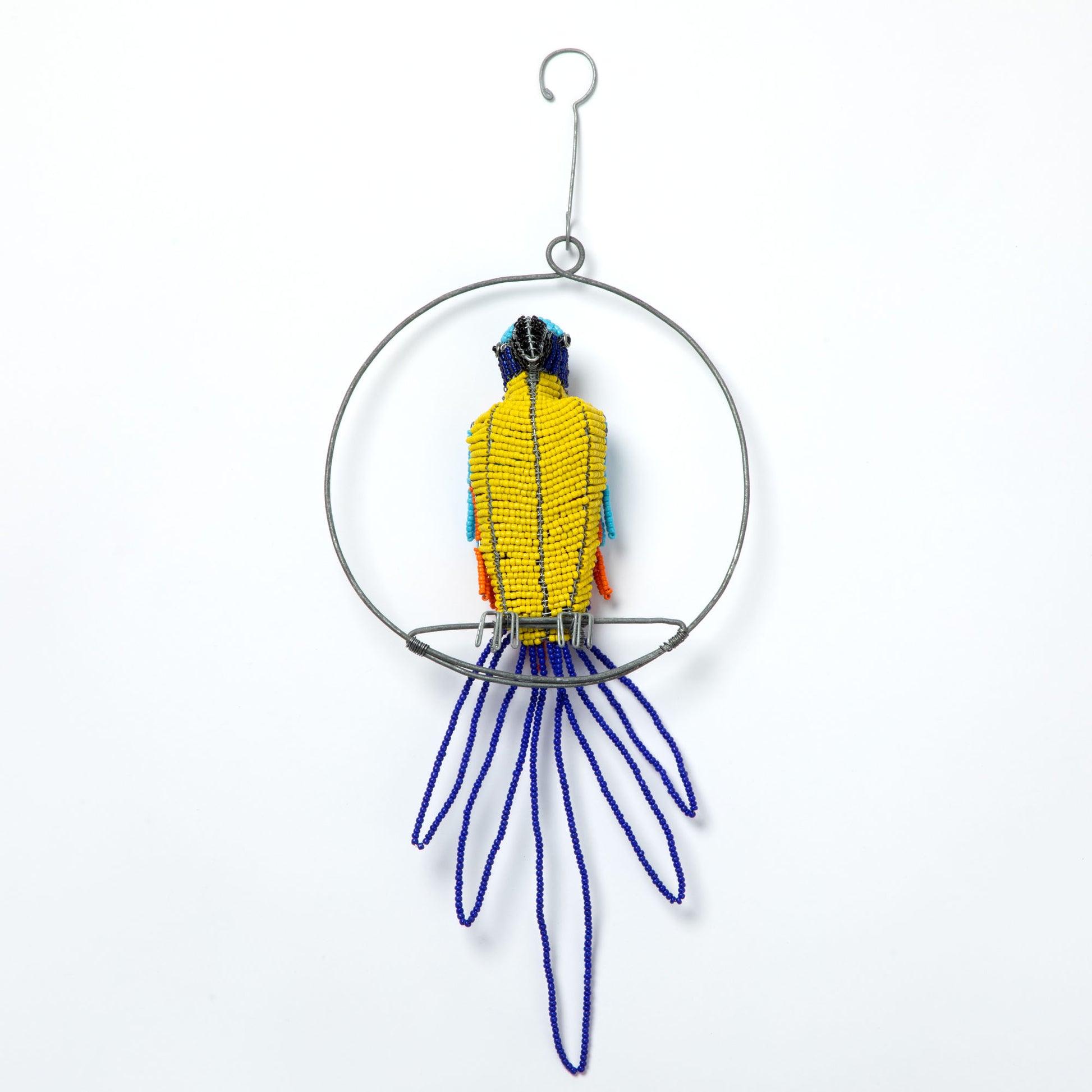 Bring a splash of tropical fun to your space with this charming hanging decor. Handmade by skilled artisans in Zimbabwe, each vibrant parrot is crafted from colorful beads and wire, perched on a simple wire swing. Its long, dangling tail adds a playful touch, perfect for brightening windows, porches, or any cozy corner. Full of personality, this cheerful piece of handmade art captures the lively spirit of the tropics wherever it’s displayed.