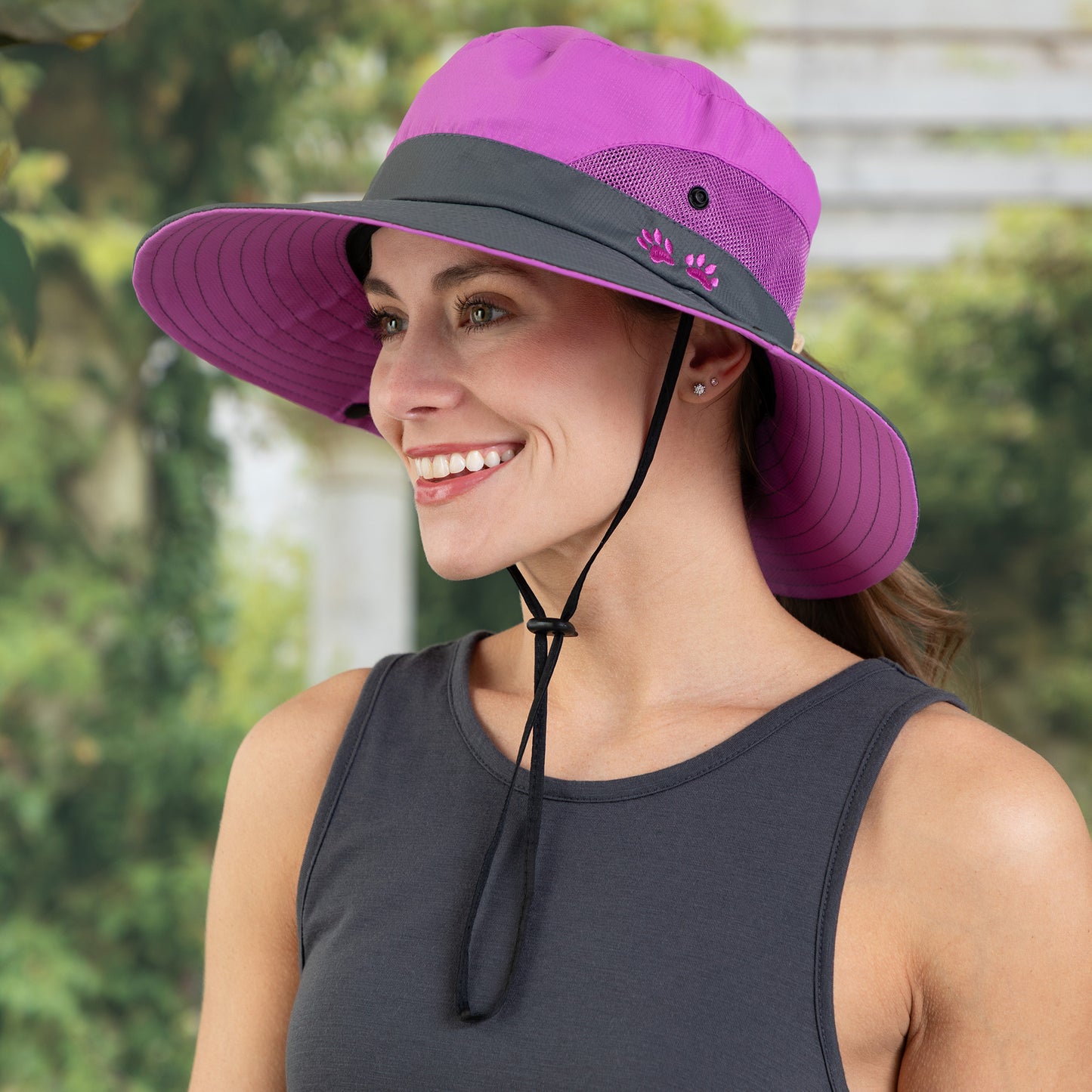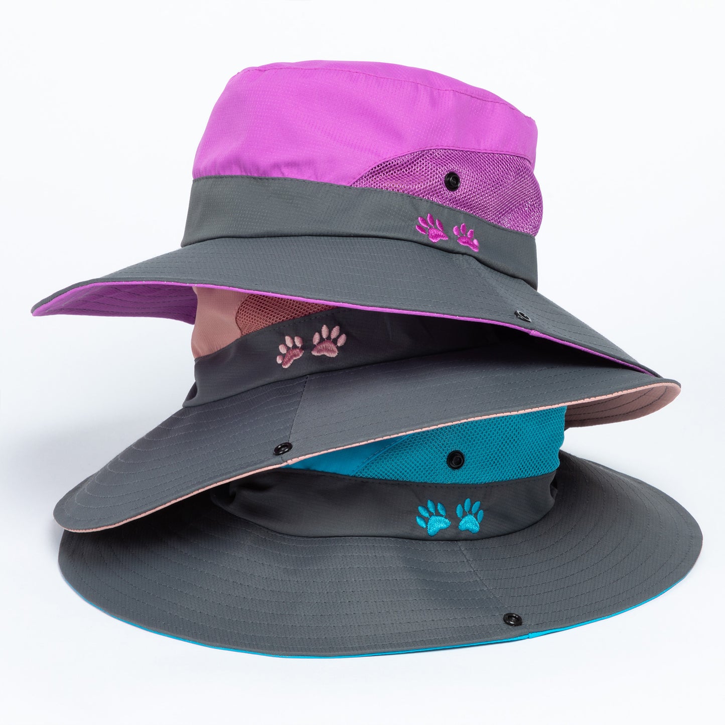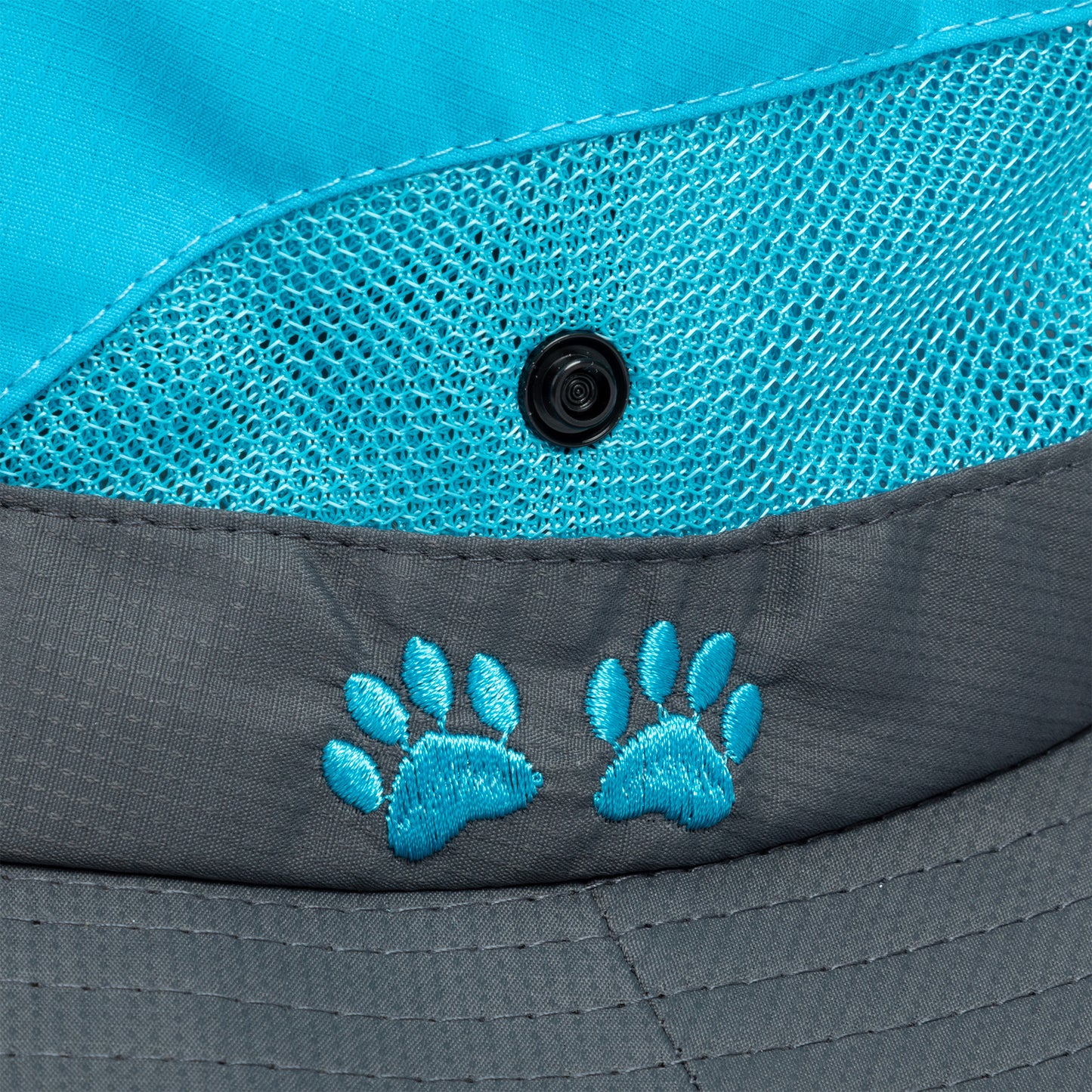 Stay cool and stylish with this breathable sun hat, featuring a custom two-paw embroidered detail on the side. Crafted from 100% lightweight polyester with built-in UPF 50+ protection, it offers all-day comfort and practical sun defense. A built-in ponytail hole and adjustable chin and back straps ensure a secure, personalized fit, while the washable fabric makes care a breeze. Whether you're hiking, gardening, or lounging by the water, this hat keeps you protected and effortlessly polished.