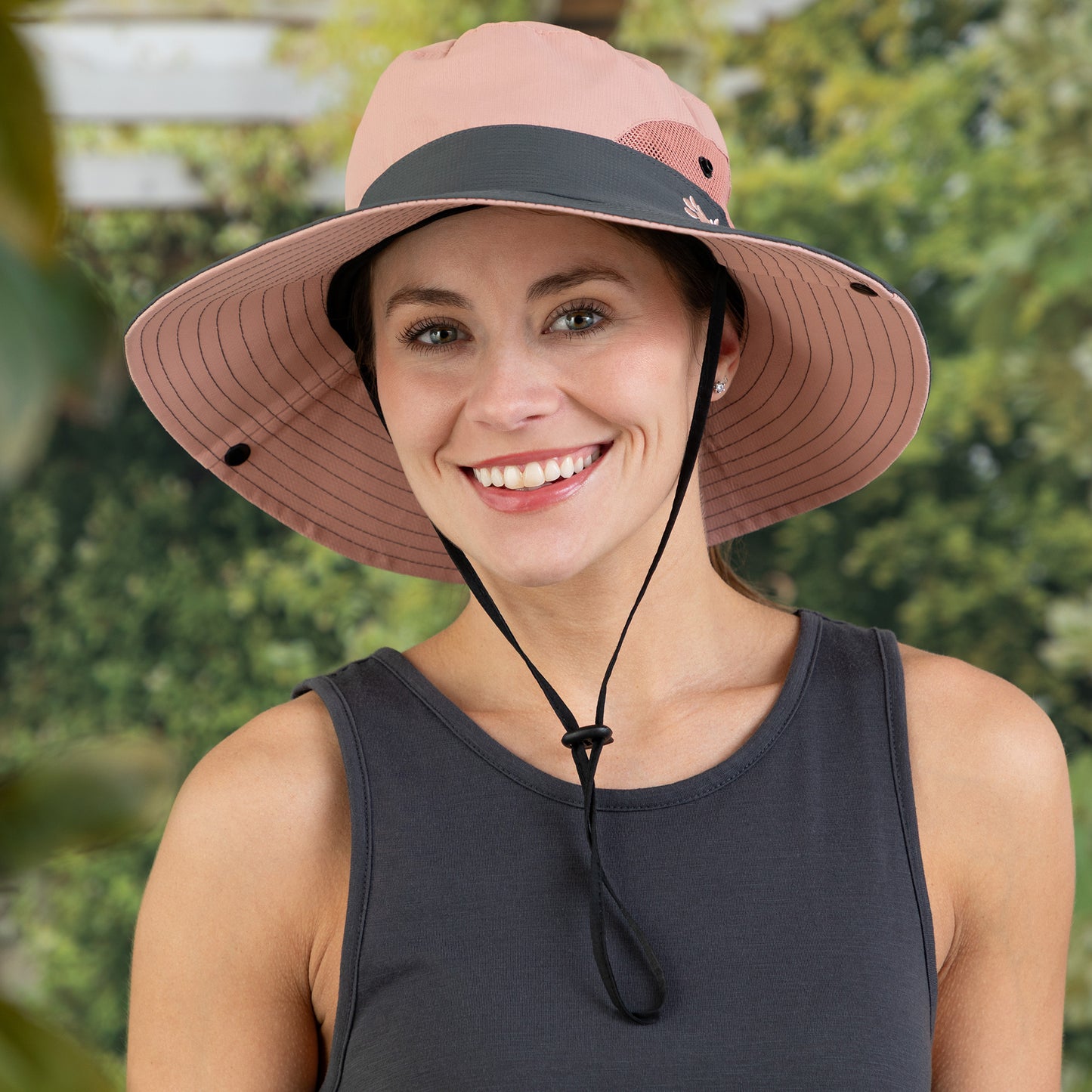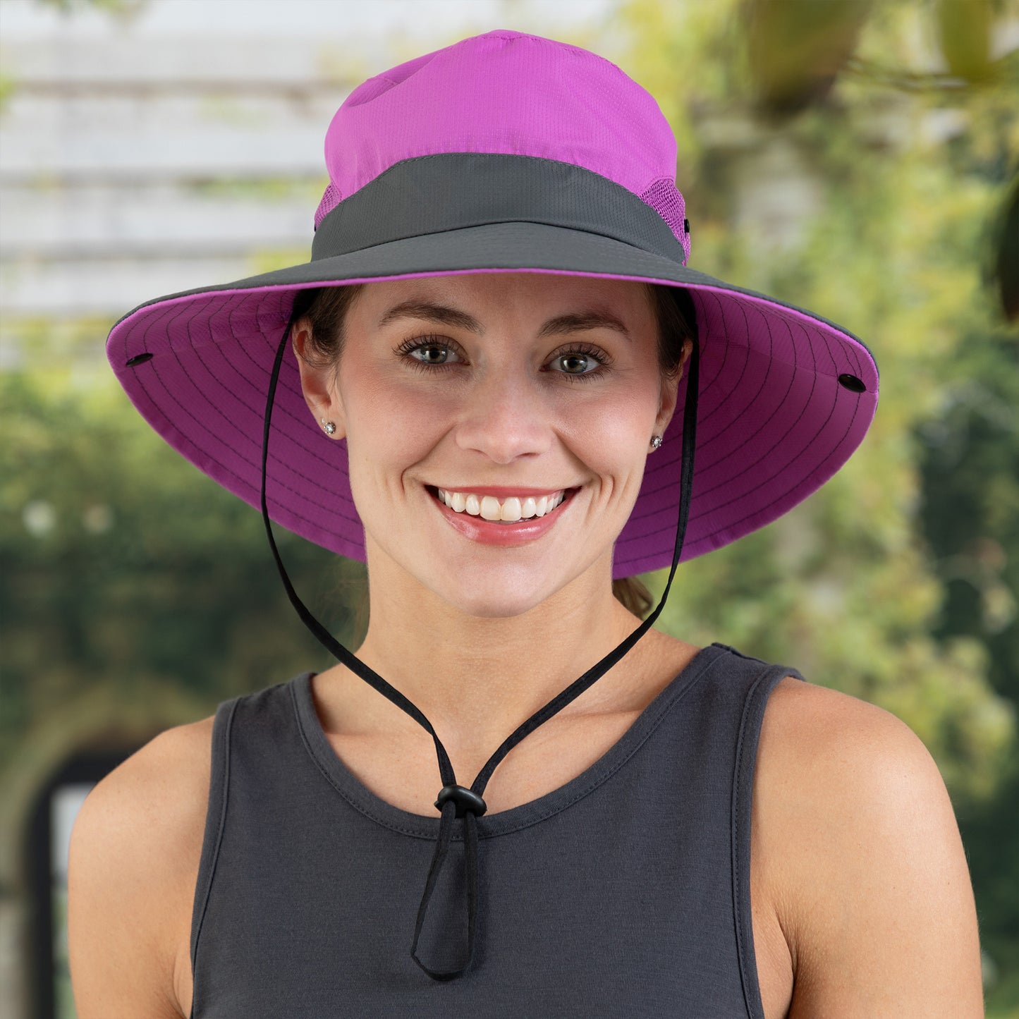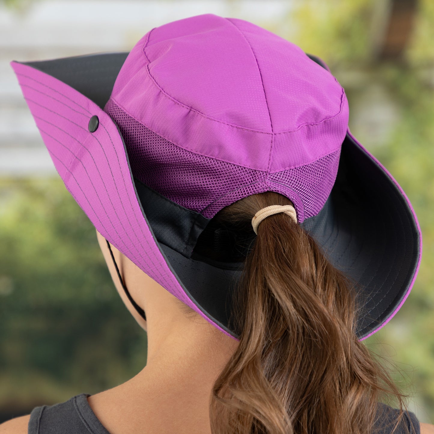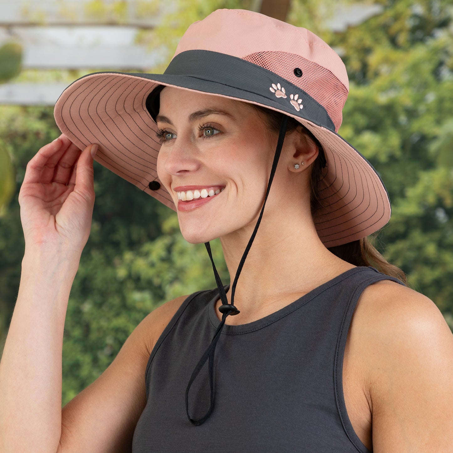 Stay cool and stylish with this breathable sun hat, featuring a custom two-paw embroidered detail on the side. Crafted from 100% lightweight polyester with built-in UPF 50+ protection, it offers all-day comfort and practical sun defense. A built-in ponytail hole and adjustable chin and back straps ensure a secure, personalized fit, while the washable fabric makes care a breeze. Whether you're hiking, gardening, or lounging by the water, this hat keeps you protected and effortlessly polished.