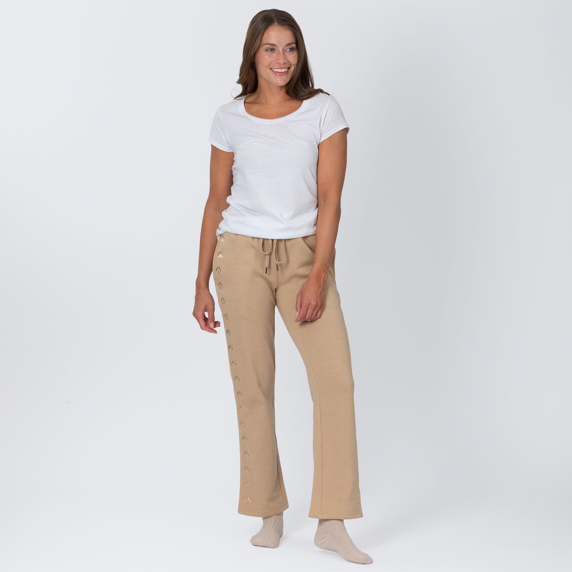 Cozy meets effortlessly chic with these embroidered straight leg sweatpants. Made from a soft cotton-poly blend, they feature a flattering straight-leg cut, roomy pockets, and an adjustable drawstring waist for a just-right fit. Subtle paw print embroidery runs down each leg for a touch of playful charm that sets them apart. Available in versatile tan or classic black, these pants make lounging, walking the dog, or running errands feel stylishly relaxed.