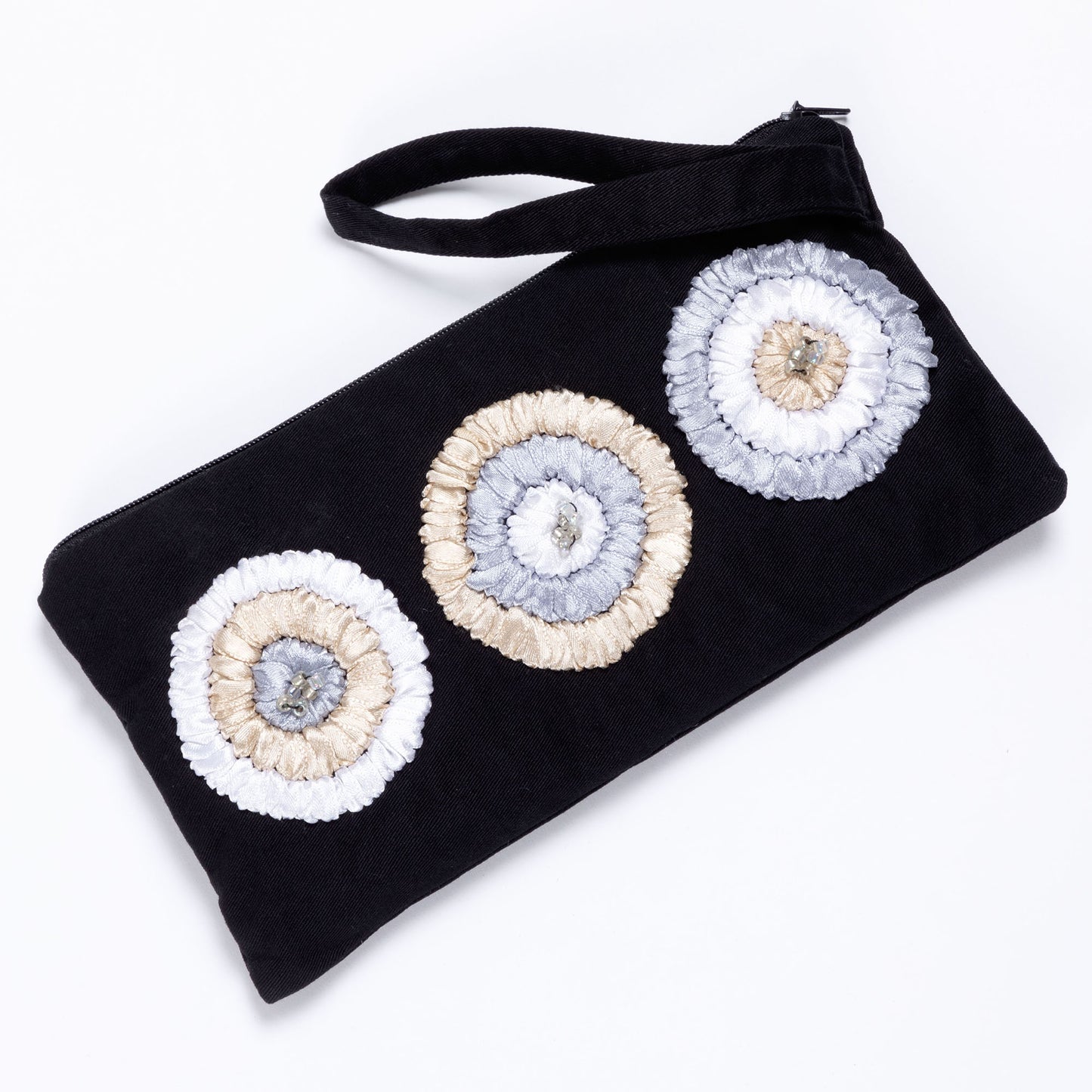 Salvadoran Circles: satin, glass beads, & cotton/poly blend canvas
