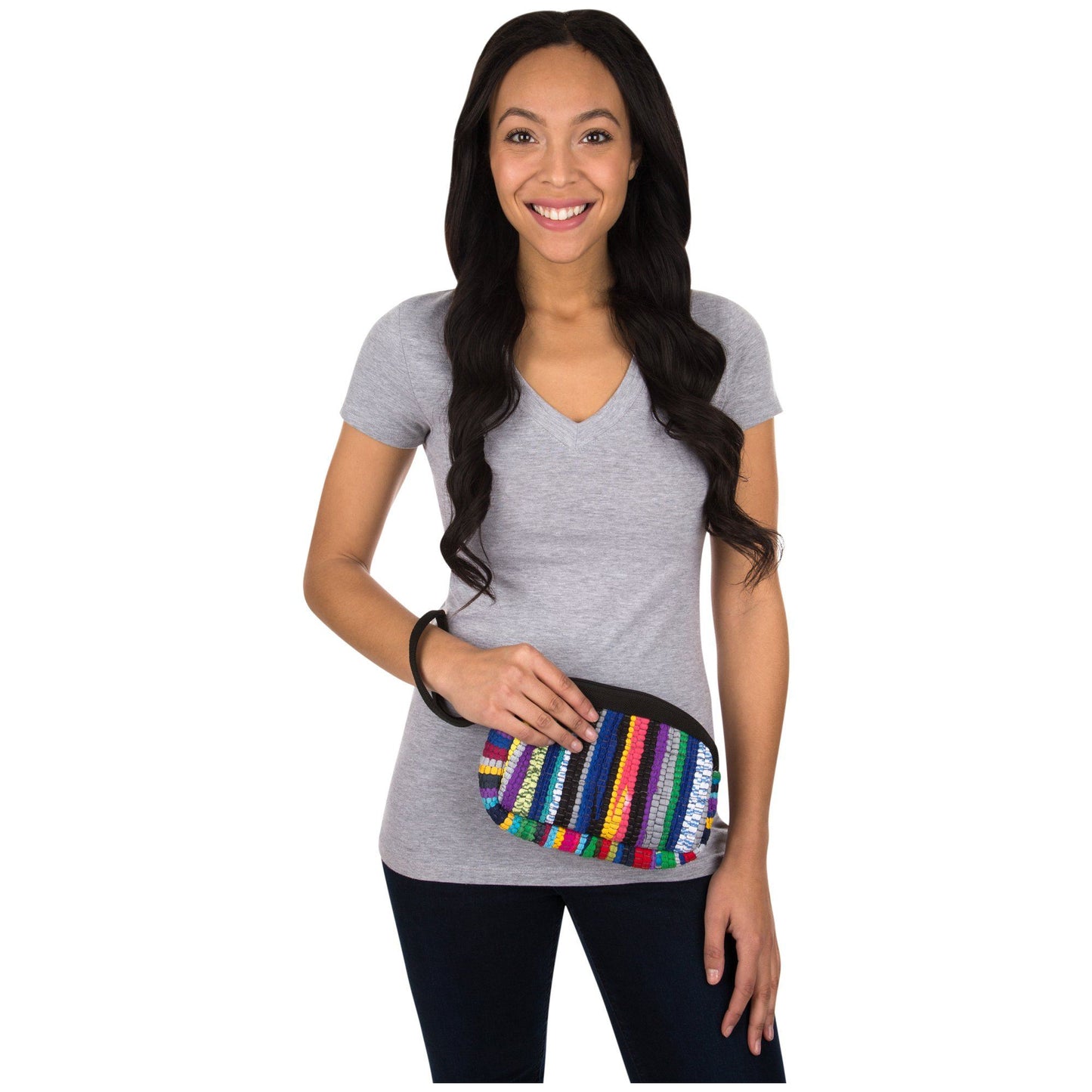 Scraps of brightly colored fabric from local apparel factories in Delhi are gathered and woven in the classic, well-loved "rag rug" style and fashioned into a colorful carry-all wristlet. Created by the women recycling artisans of Conserve India.