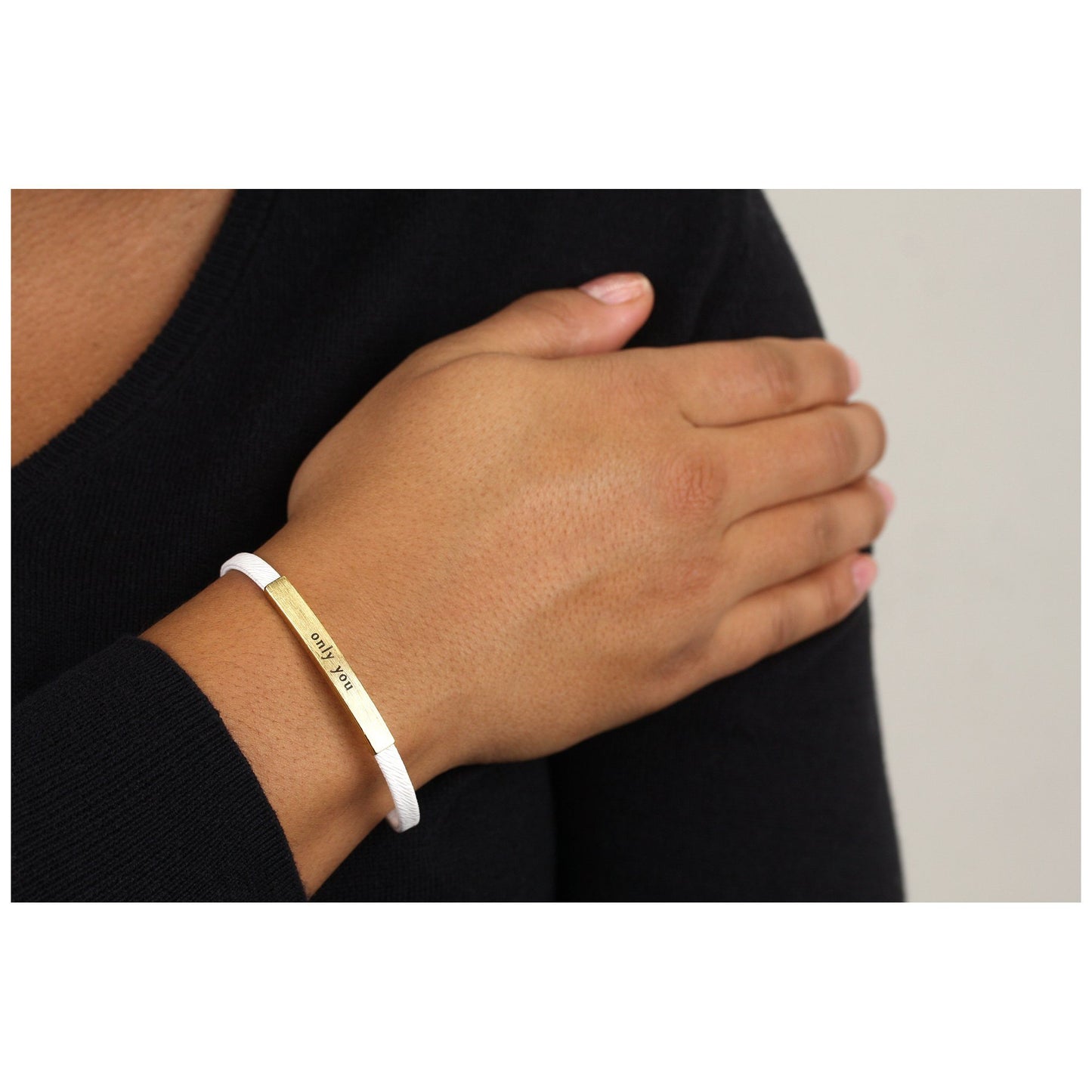 It's all about you. That is, only you have the power to change your life. Wear this striking combination of gold-tone and faux white leather as an inspiring accessory, or give it as a gracious gift.