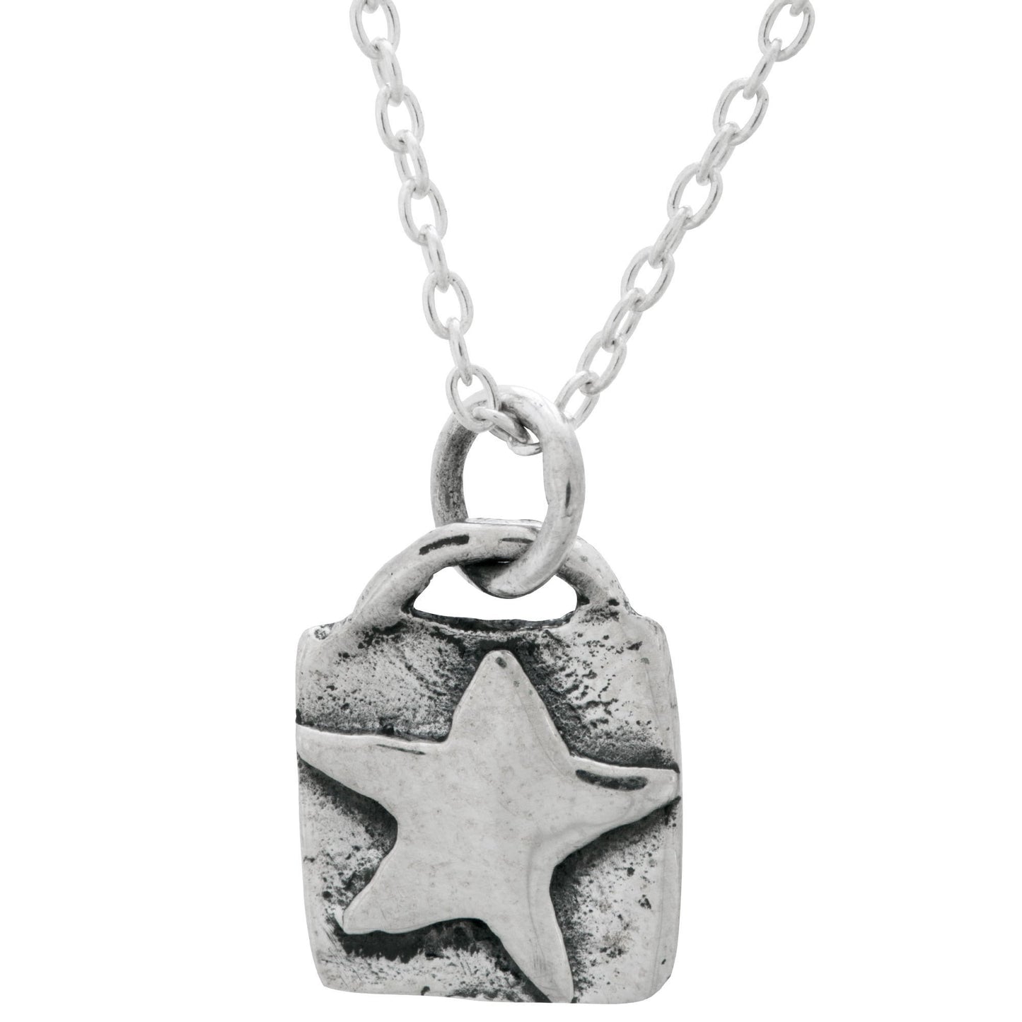 Etched in a square of sterling silver, this five pointed star is a symbol of luck. Make a wish as your proudly wear this charming necklace!