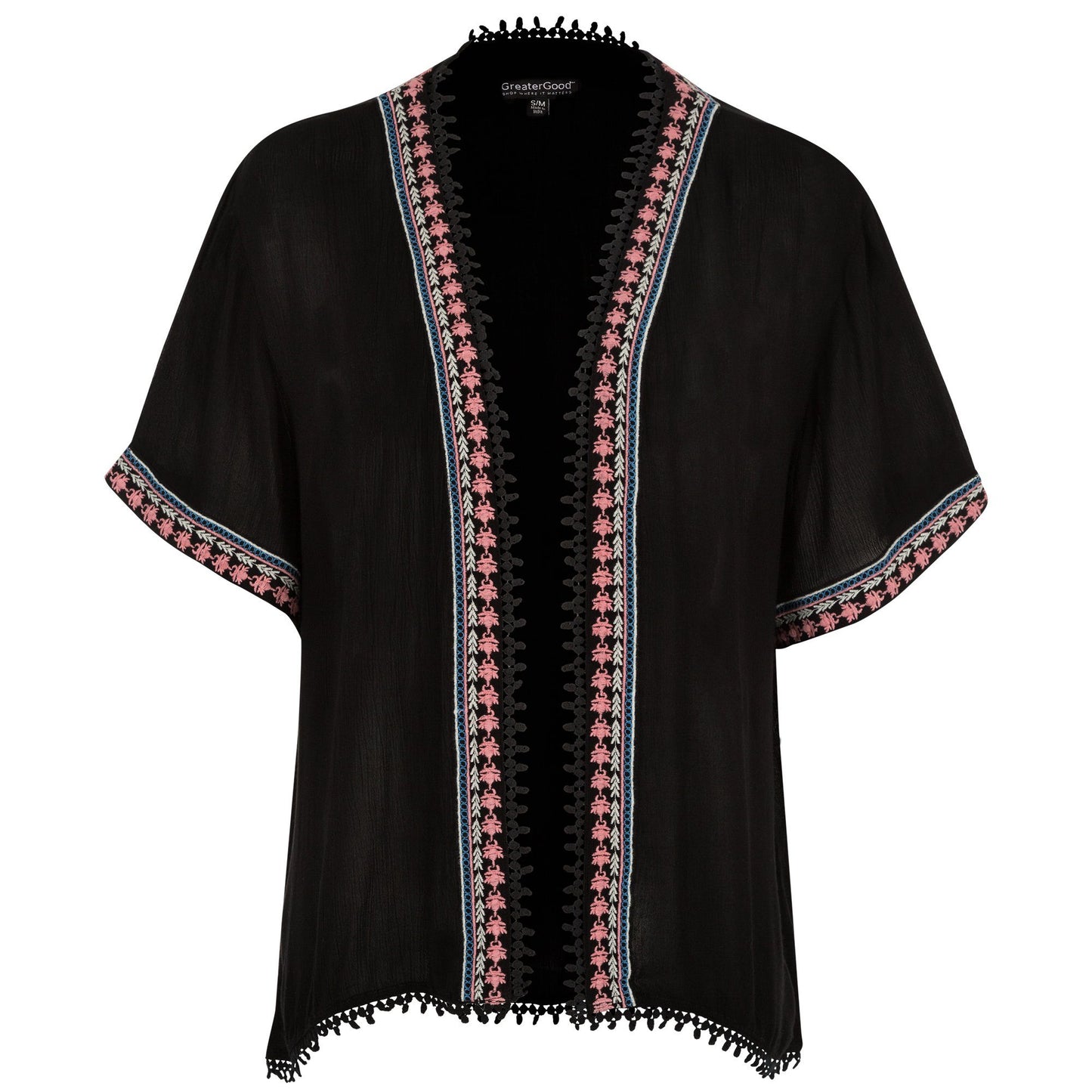 An alluring top to finish off your ensemble, this beautiful black layer is sure to intrigue. Sheer, lightweight fabric is highlighted with embroidered stripes of pink, mint-green, and blue down the front and sleeve hems. Proof a light touch can easily transform your whole look!