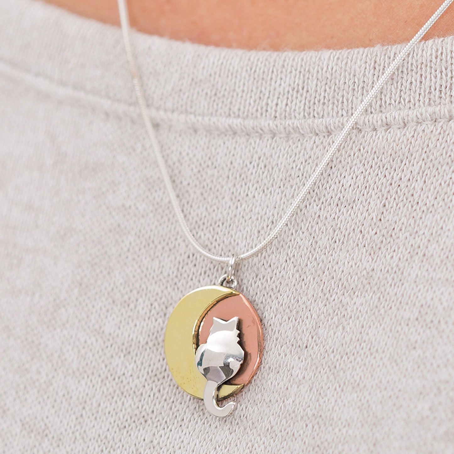 Dream big with the mixed metal charm of this enchanting, handmade necklace. Featuring a sterling cat silhouette on a moon of copper and brass, it serves as an invitation to keep your dreams alive while contributing to the well-being of fair-trade artisans.