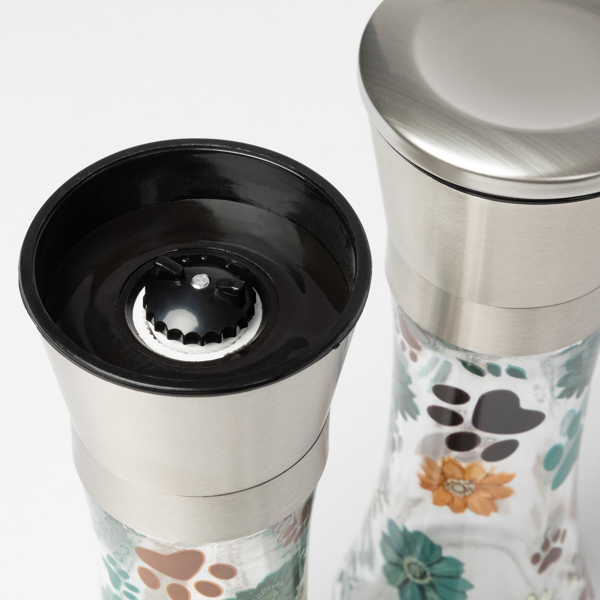 A dash of salt and pepper to your favorite dish is a delightful experience with these brightly patterned grinders. With a sleek and modern design, this glass and stainless steel pair features decal designs with gardens featuring dragonflies or paw prints, or colorful cats and dogs -- a standout pair that displays your taste!