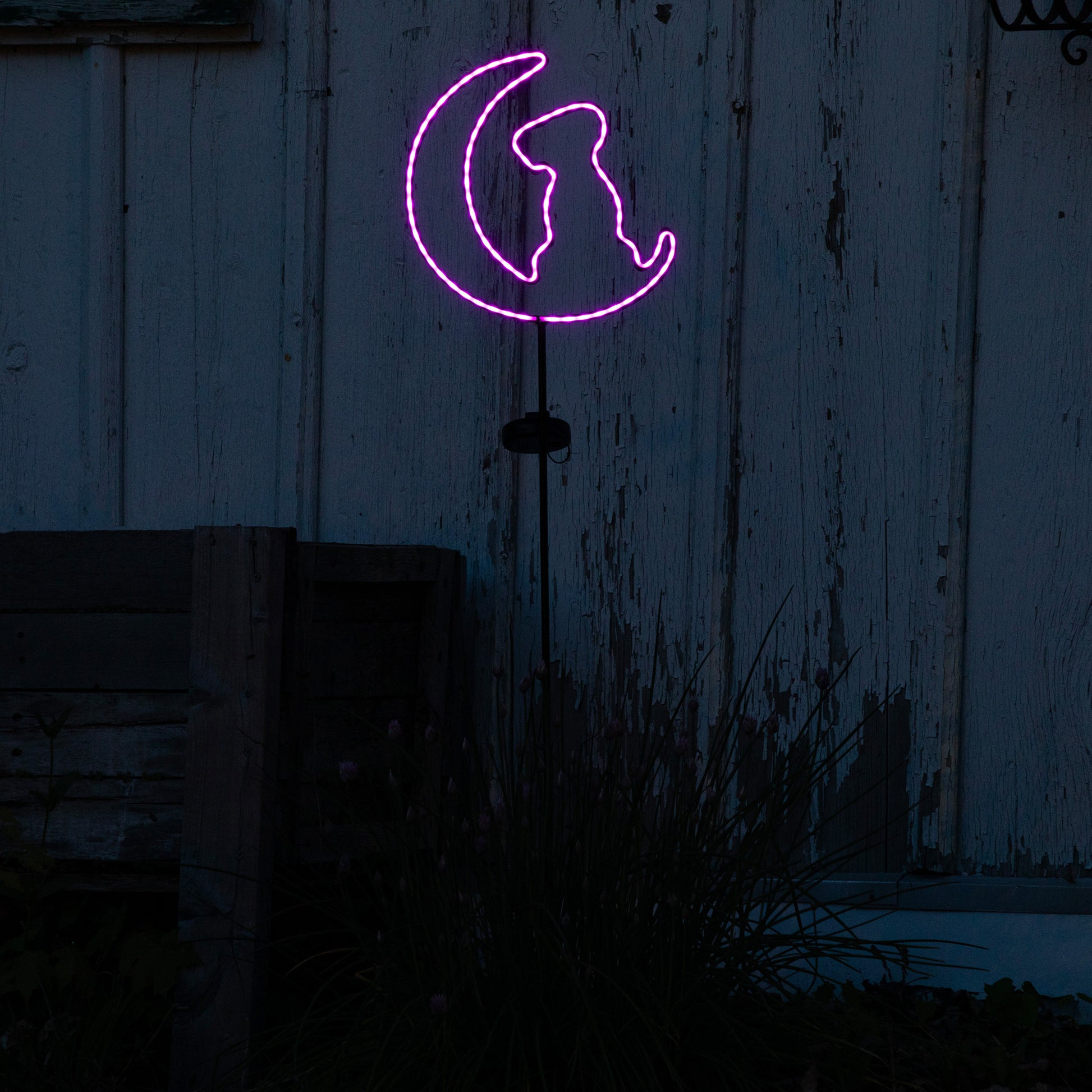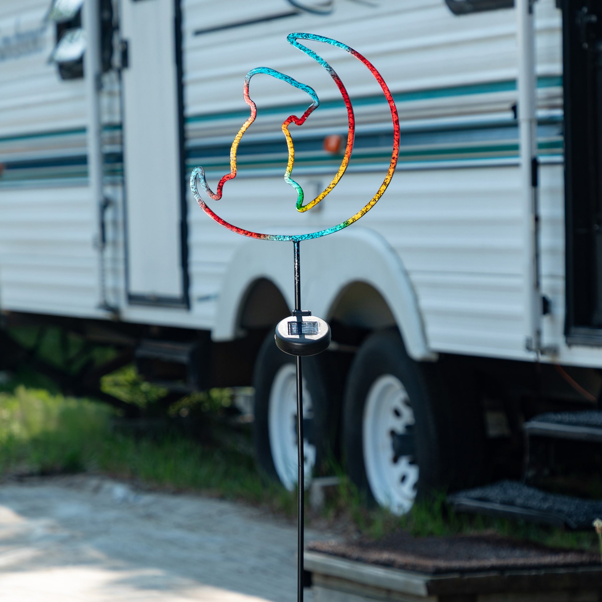 While the solar panel charges during daylight hours, the silhouette of the garden stake is gorgeous on its own! Sparkling rainbow colors during the day, and glowing neon hues at night. Crafted with metal for a sturdy piece of decor that won’t blow over, and can handle everyday wear of natural elements.