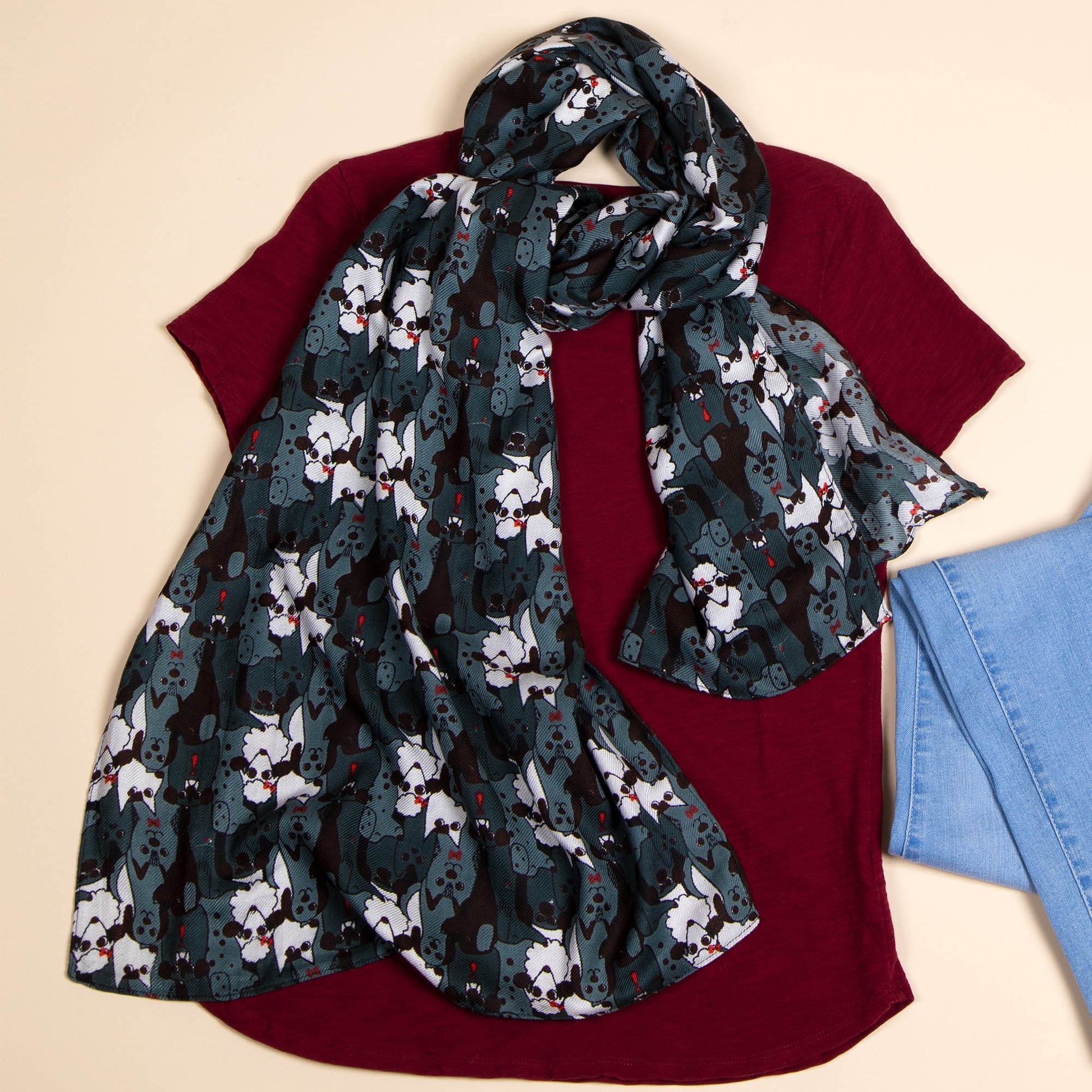 Black, white, and gray with pops of color throughout make this sheer, lightweight scarf both charming and versatile! Patterned in pups galore, the breezy accessory adds canine character to your whole look.