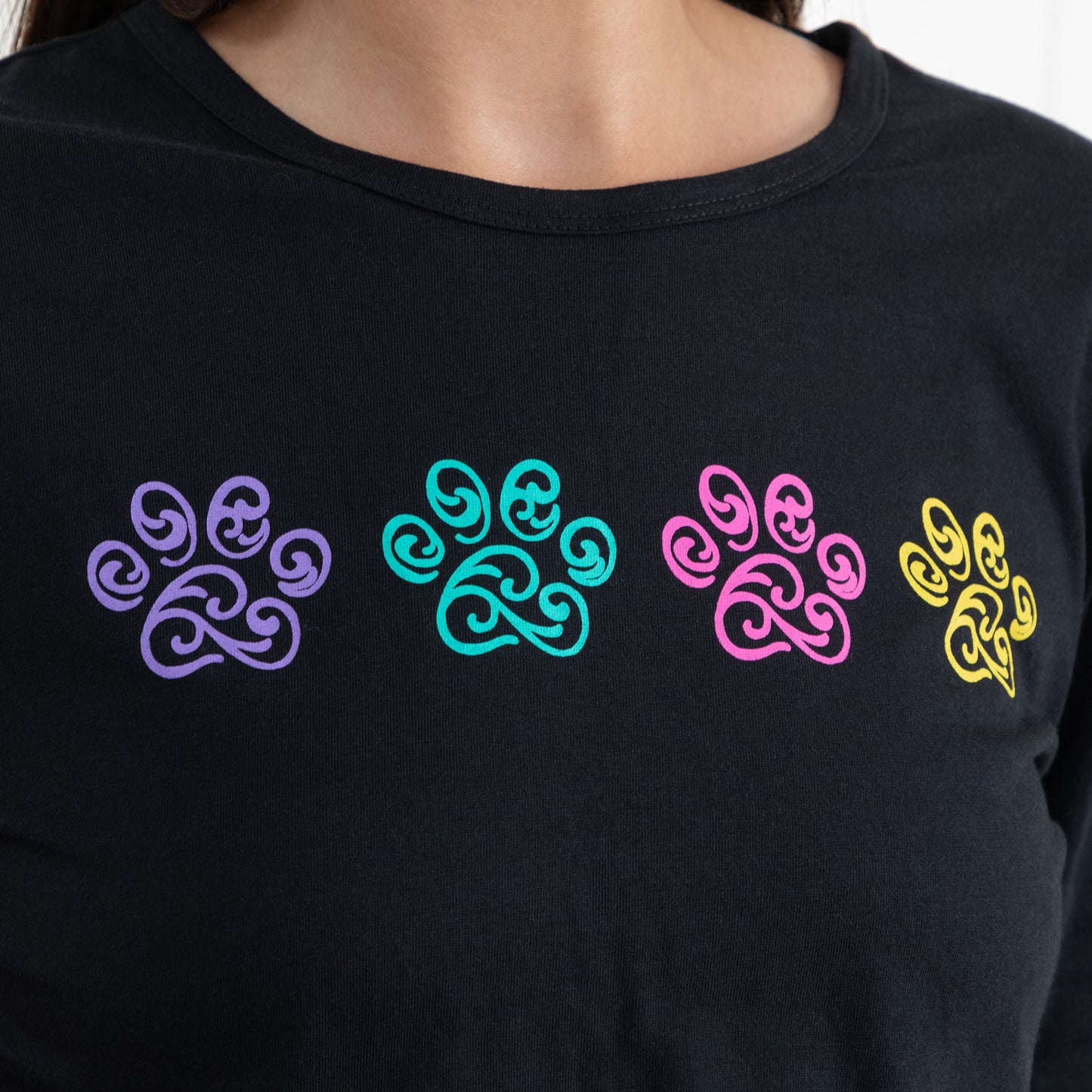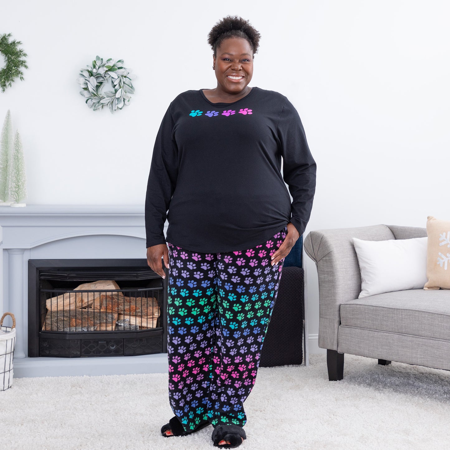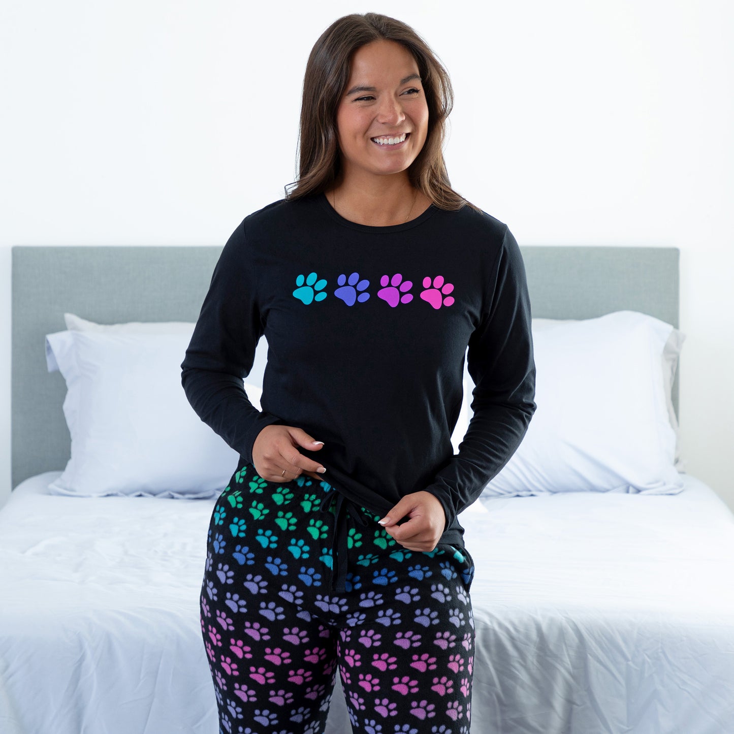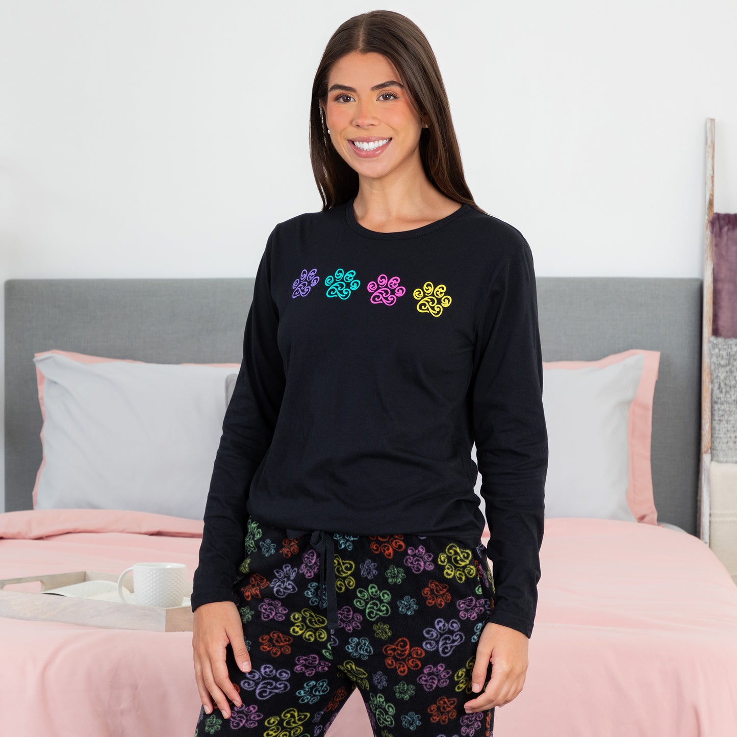 Technicolor paws pattern the pants and parade across the top of this women's pajama set! Featuring cozy soft fleece bottoms with an elastic waistband for the most comfortable fit, and a crew neck long sleeve top in black, which makes the rainbow paw prints pop in full color.