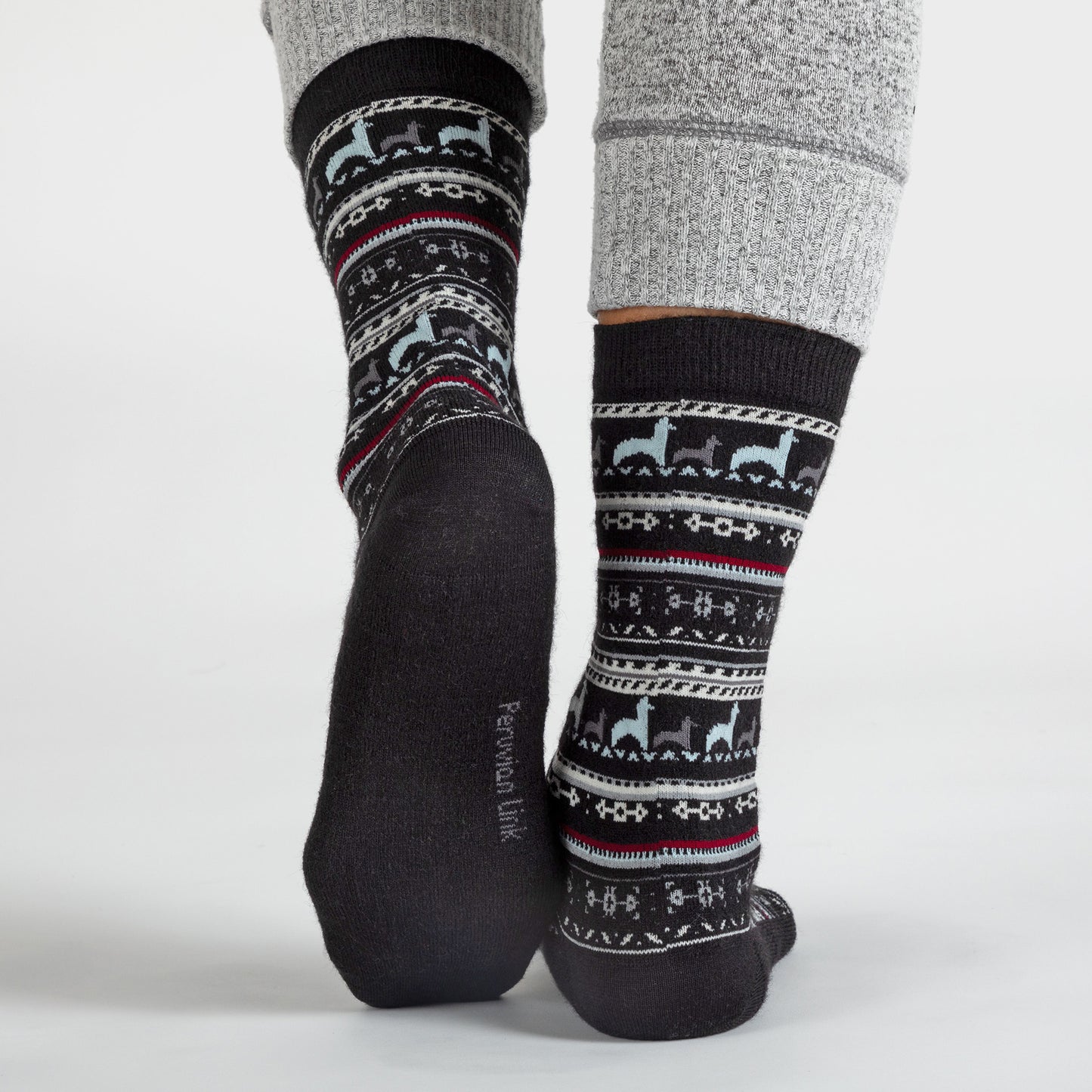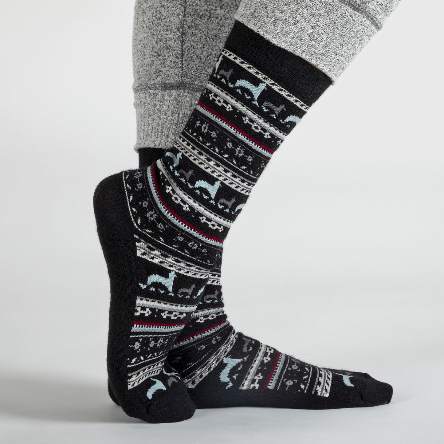 Bright colors are knitted in a striped pattern, spotted with alpaca silhouettes in this incredibly soft and stretchy pair of socks. Woven with the softest wool from the adult alpaca -- which is called baby alpaca wool due to its fine fiber size -- these socks are also made with aloe vera and jojoba oil for added softness. Plus, alpaca doesn't contain lanolin like sheep's wool, so it's hypoallergenic and doesn't have the common itchy wool feel!