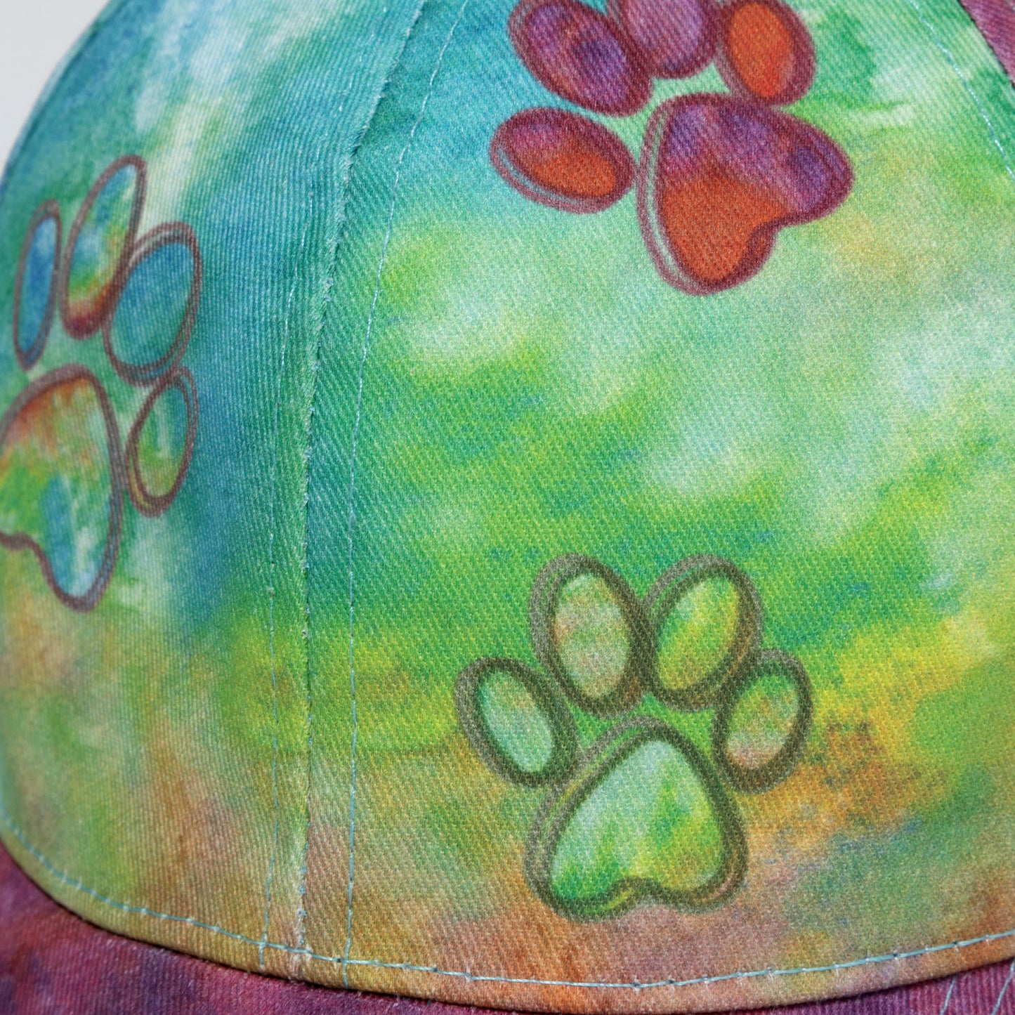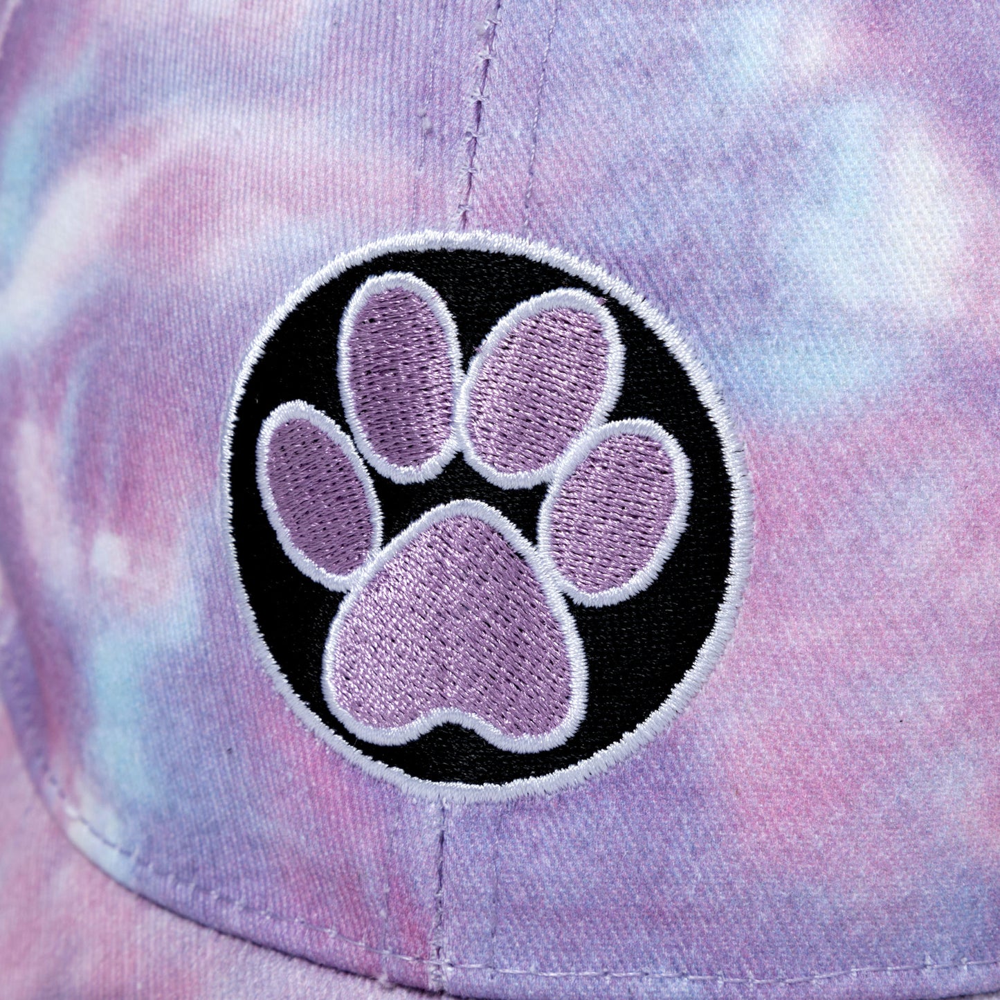 The baseball hat you cannot live without! With adjustable straps in the back that fit your ponytail perfectly, this sporty cap is colorfully tie-dyed and features embroidered paws across the front.