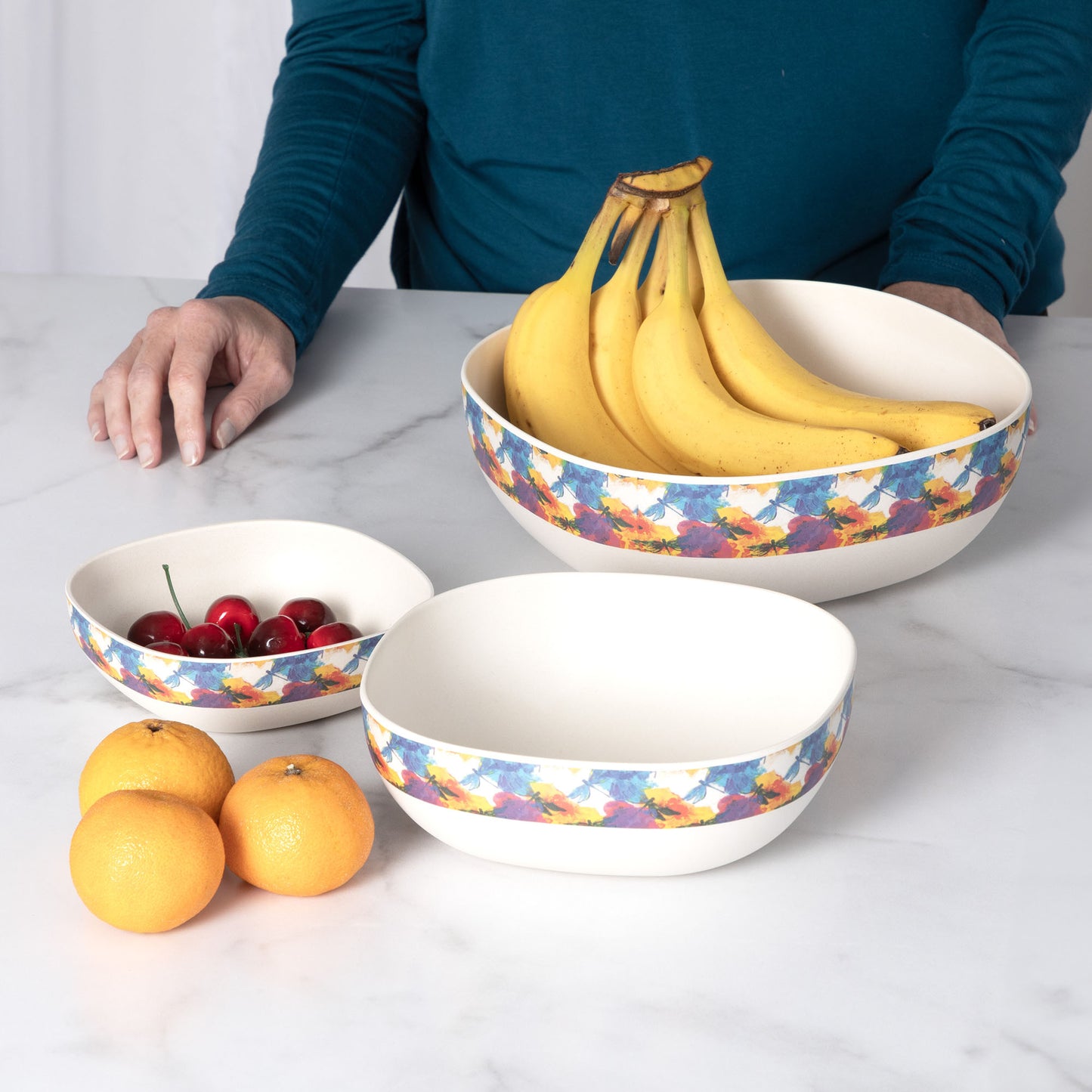 I bought the Watercolor Dragonflies set. They look just like in the listing. I use the large one for salads. The bowls are pretty, light and easy to clean. Thank you!