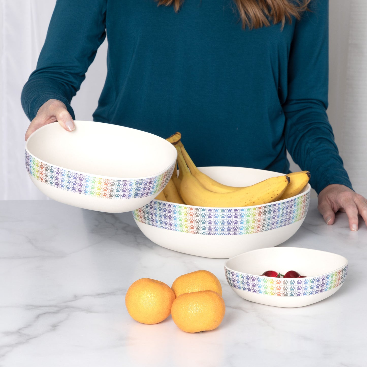 Three bowls with a million different uses! Made with bamboo fiber and melamine, this set of three nesting bowls, or salad bowl with serving utensils -- also a three piece set -- is easy to clean, and hard to break. Choose from rainbow paws or a watercolor dragonfly scene that wraps along the upper half of each bowl, and the handles of the salad servers.