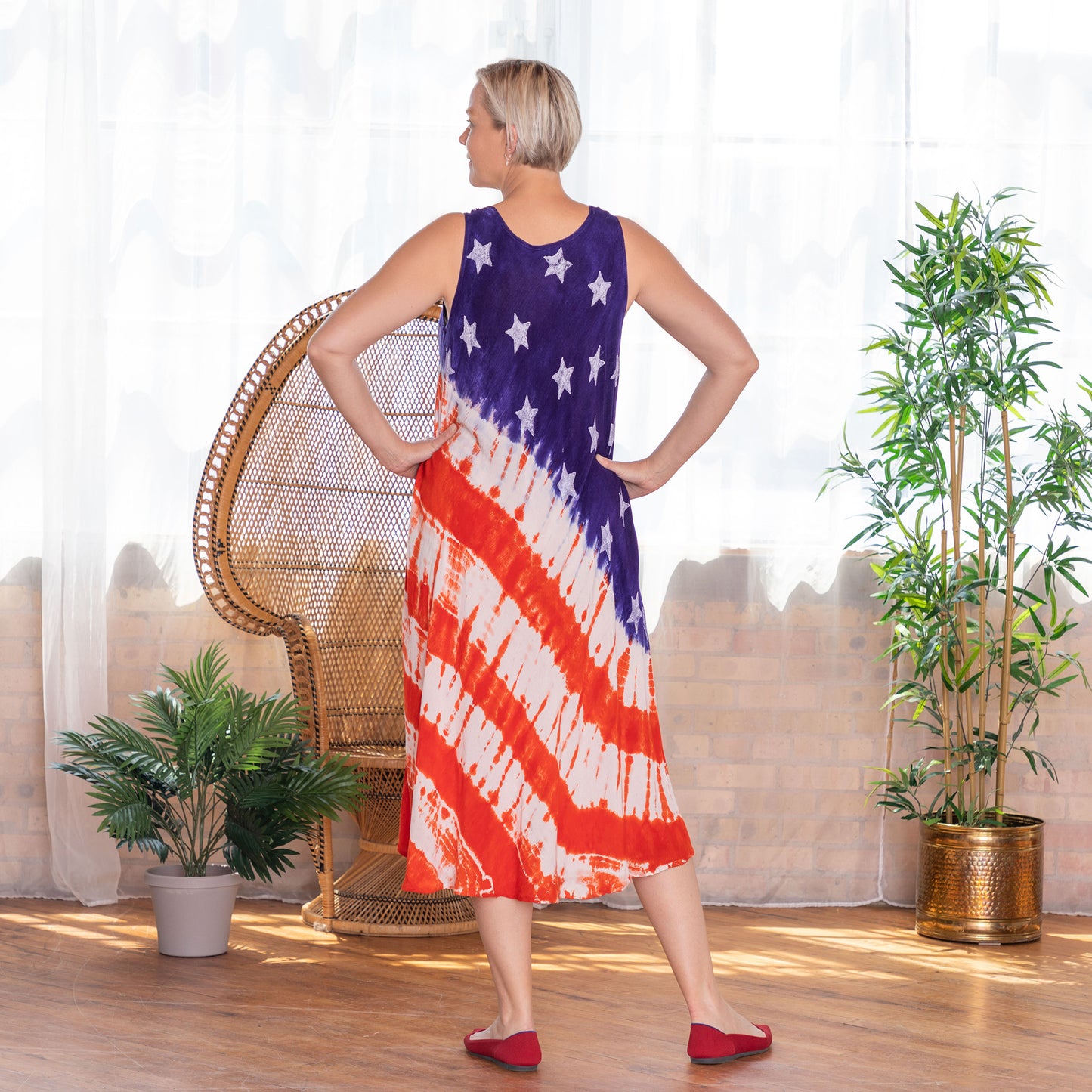 A stunning tribute to freedom, unity, and style. Made from lightweight fabric, this sleeveless dress offers comfort and freedom of movement, perfect for any occasion. The diagonal stars and stripes pattern adorning the dress captures the essence of the American flag, exuding a sense of patriotism and pride. The long, flowing silhouette adds an air of sophistication, while the sleeveless design keeps you cool and comfortable on warm summer days.