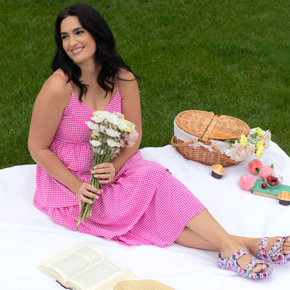 The ultimate warm weather outfit, this multi-tiered maxi dress makes an impact with the pink and white gingham print! Topped with a fitted bodice, zipper up the back, and adjustable straps, it's a versatile piece for dressing up or down.