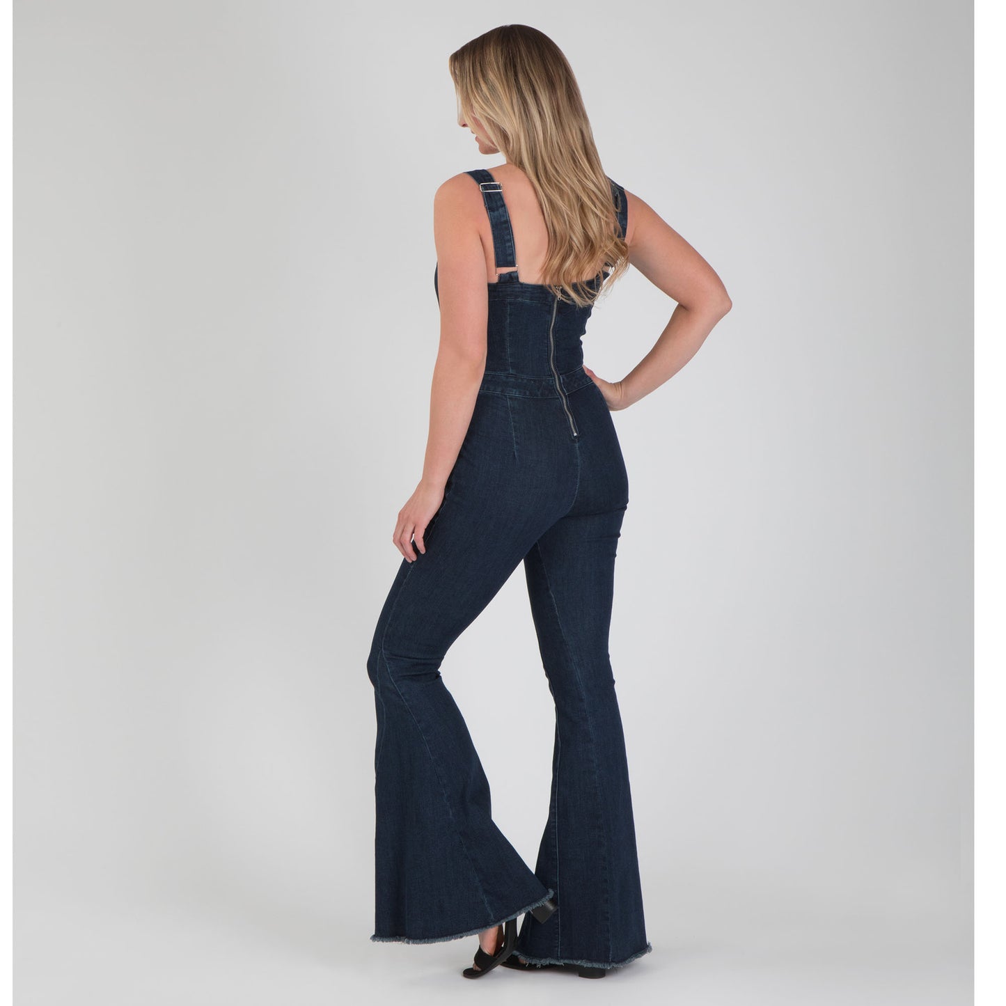 A retro twist, this classic dark denim jumpsuit is your new favorite alternative to the little black dress! Made with cotton denim and a touch of spandex for the absolute perfect fit, this piece features buttons up the front and a cute straight neckline with shoulder straps, a wide leg, and back zipper closure.