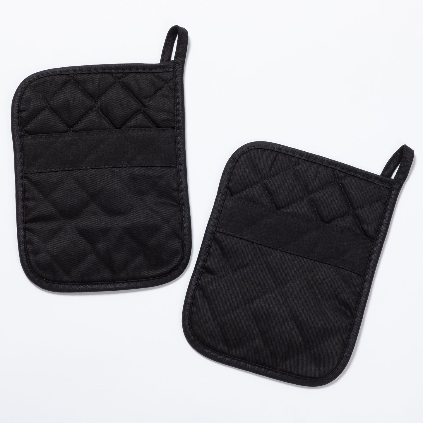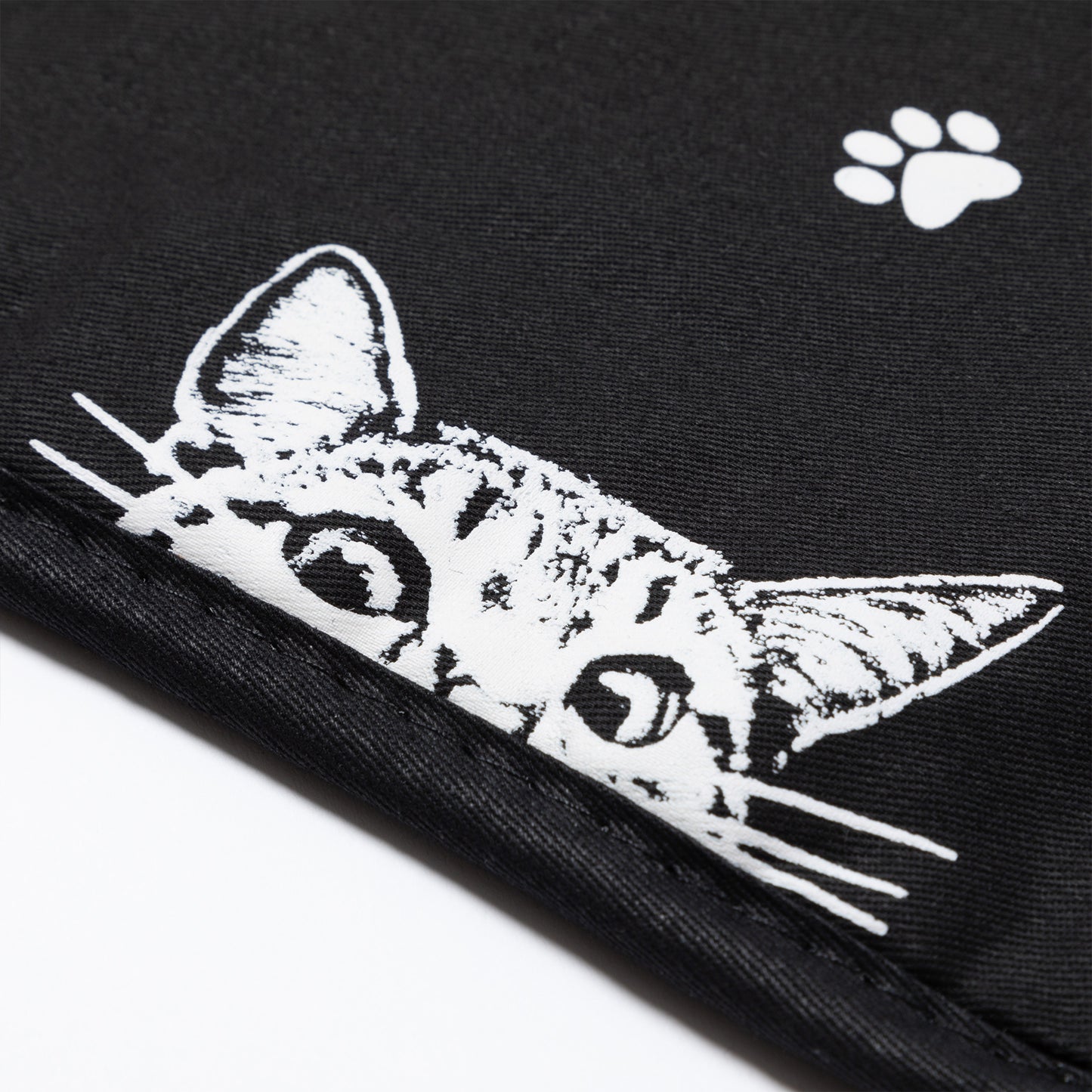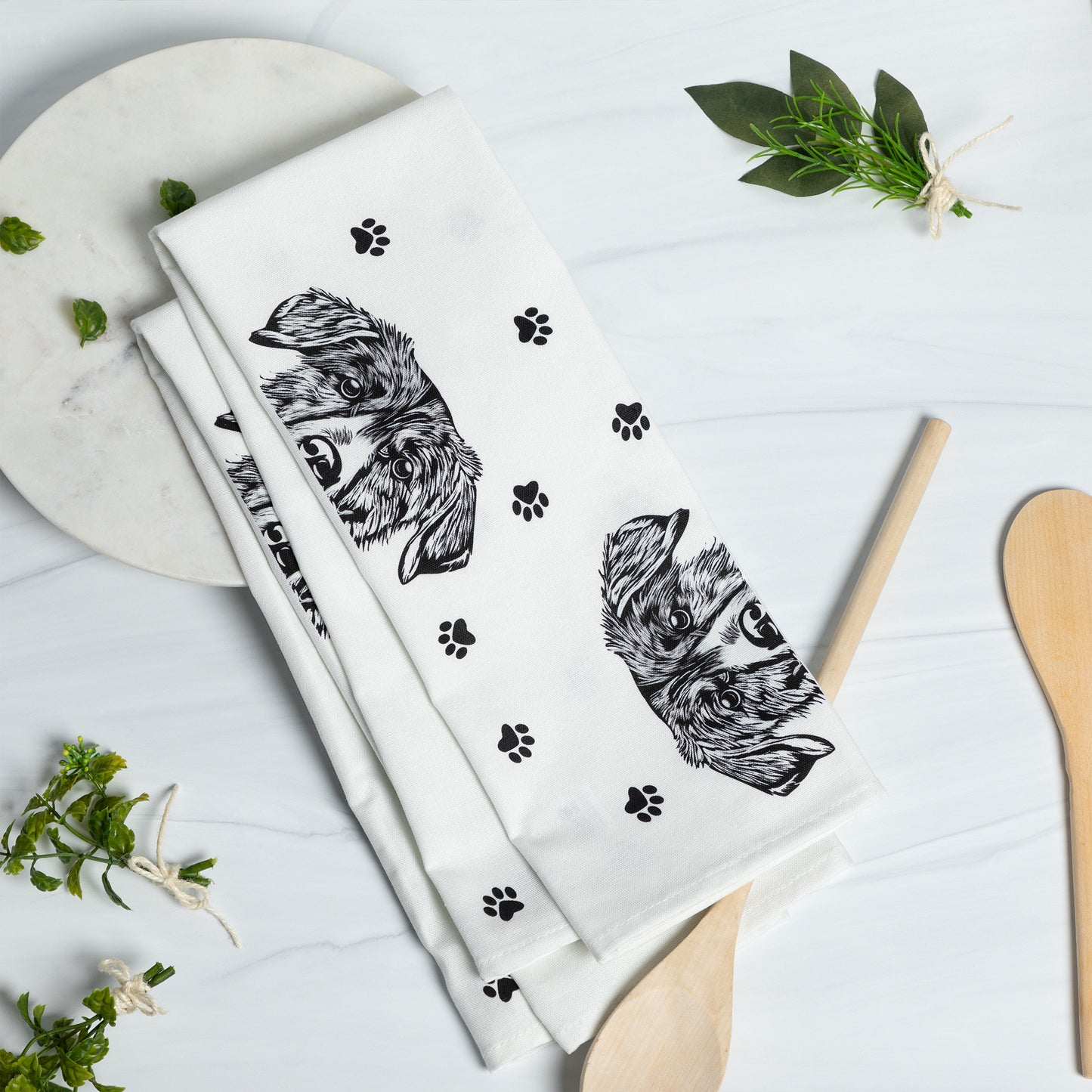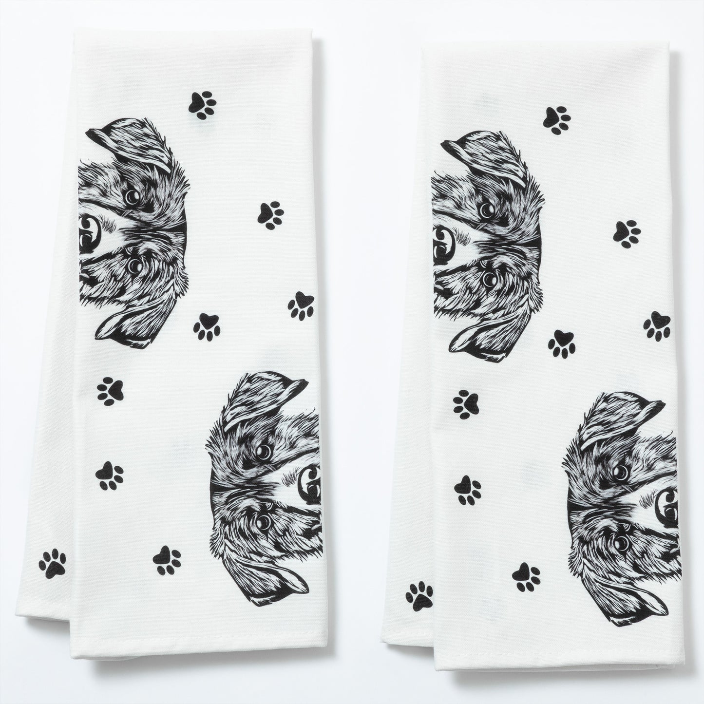 Adorably peeking out of the side of each set of two kitchen towels or pot holders are whiskered feline faces or precious pups! Paw prints also pattern this black and white themed set, made with 100% cotton for a modern yet playful addition to your kitchen.