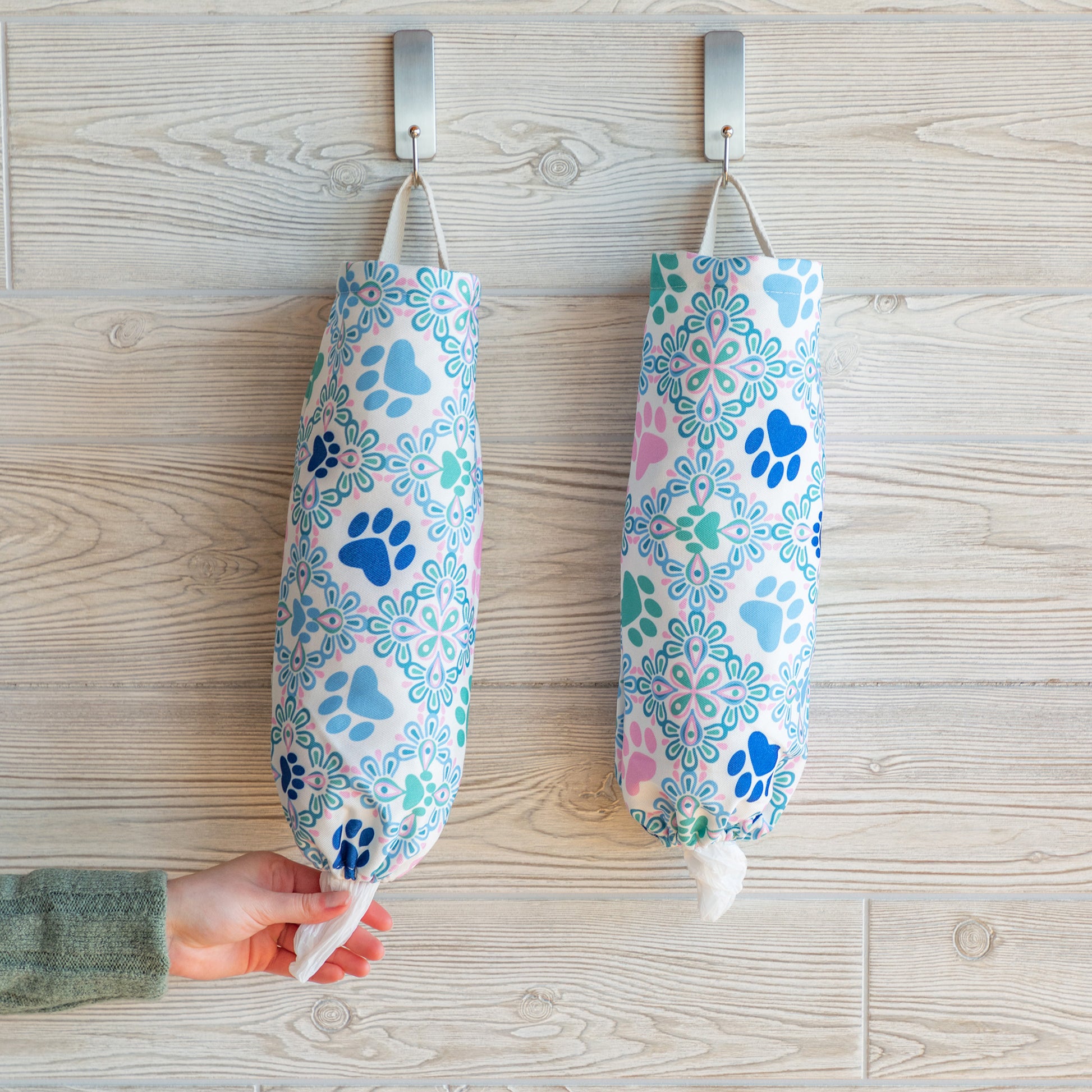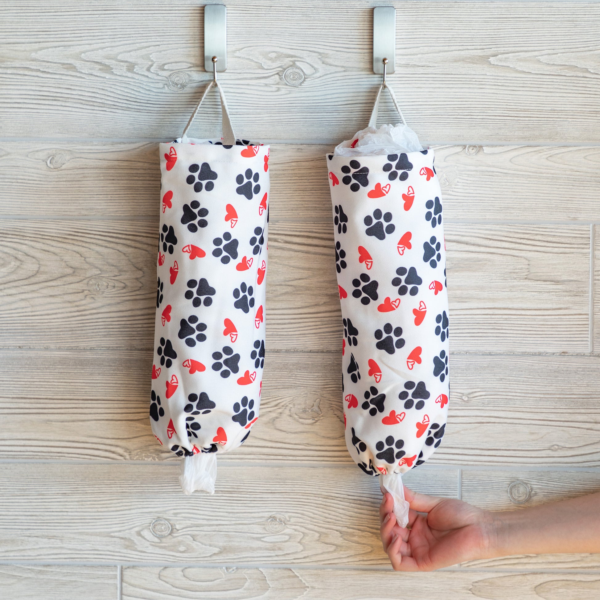 Looking for a way to re-use single use plastic bags while keeping your home tidy and organized? This paw-printed pair of bag holders makes it easy to give plastic bags multiple uses, while the vertical hanging design keeps it easy-to-use and out of your way. Tuck new bags into the top, and pull single bags out through the dispenser at the bottom for a better way to streamline your home!