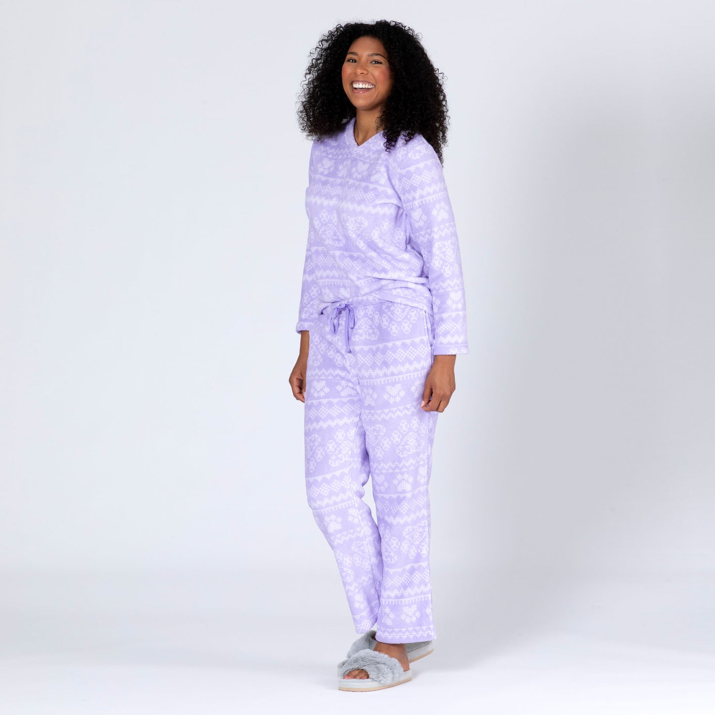 Snuggle up in paw prints and supreme softness with this Super Cozy™ fleece pajama set! The long sleeve top features a v-neckline and the pants offer an elastic waistband with a drawstring for the perfect fit. Plus, pockets!