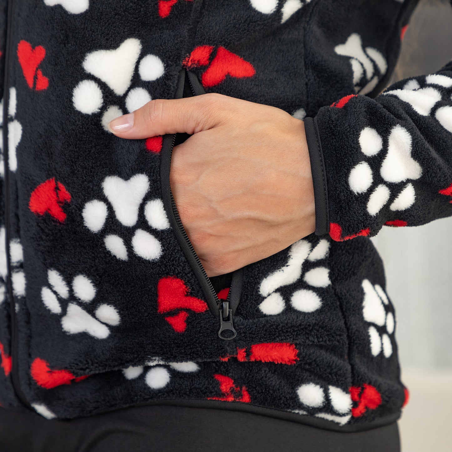Patterned in a playful all-over paw print design, this full zip fleece jacket is your new go-to! Made with incredibly soft sherpa fleece, a chest pocket and side zip pockets, plus a tall collar, it's fully equipped to cut the chill and keep you warm. Complete with finished contrast trim along the edges for durability and a polished look!