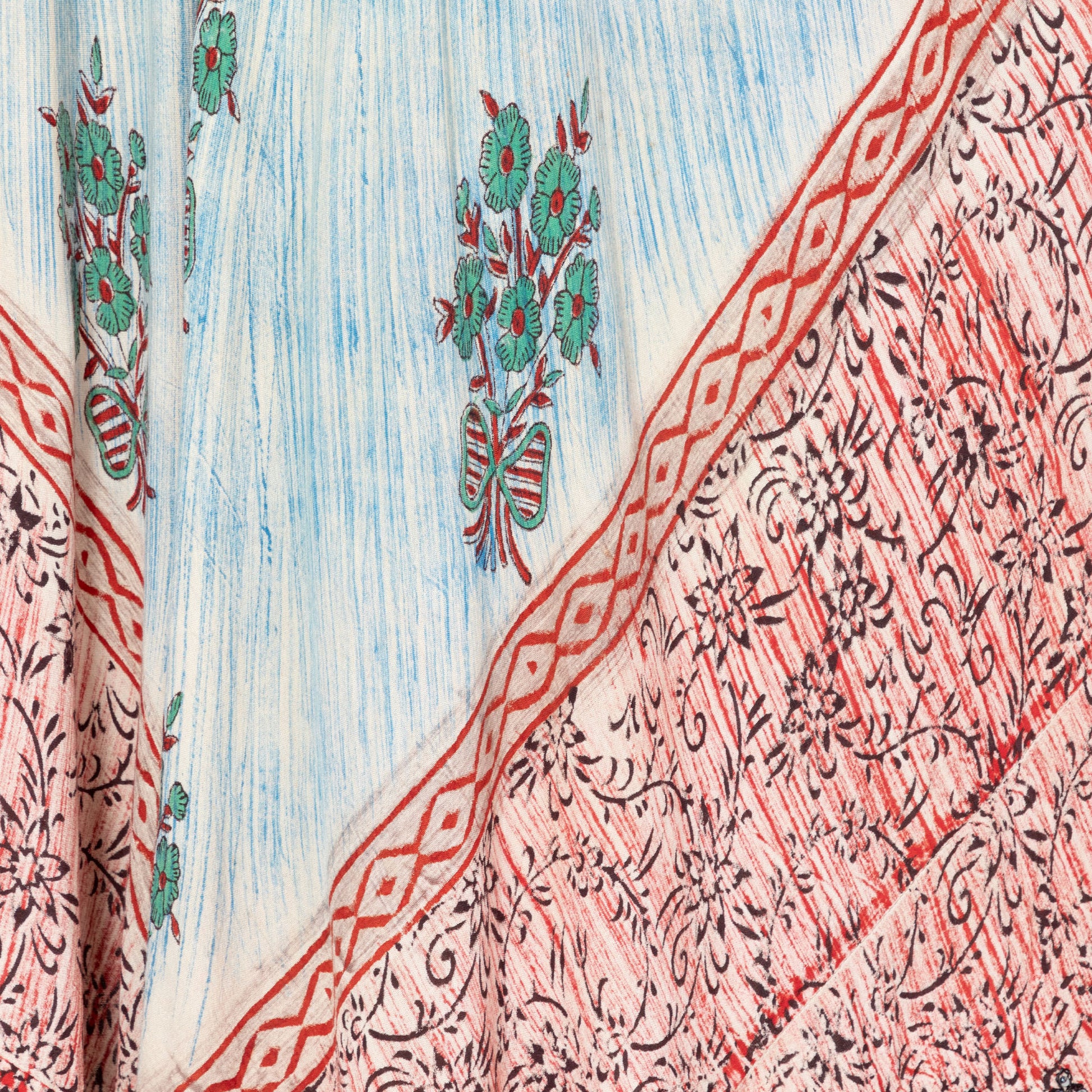 Enjoy an enchanting pastel dyed sleeveless dress, a stunning fusion of elegance and ethical craftsmanship. Handmade by skilled artisans in India through fair trade practices, this ankle-length dress features a flattering scoop neck adorned with intricate block printed flower bouquets along the front. Delicately embroidered with beaded accents along the hem and neckline, each dress is a testament to exquisite artistry and conscious fashion.