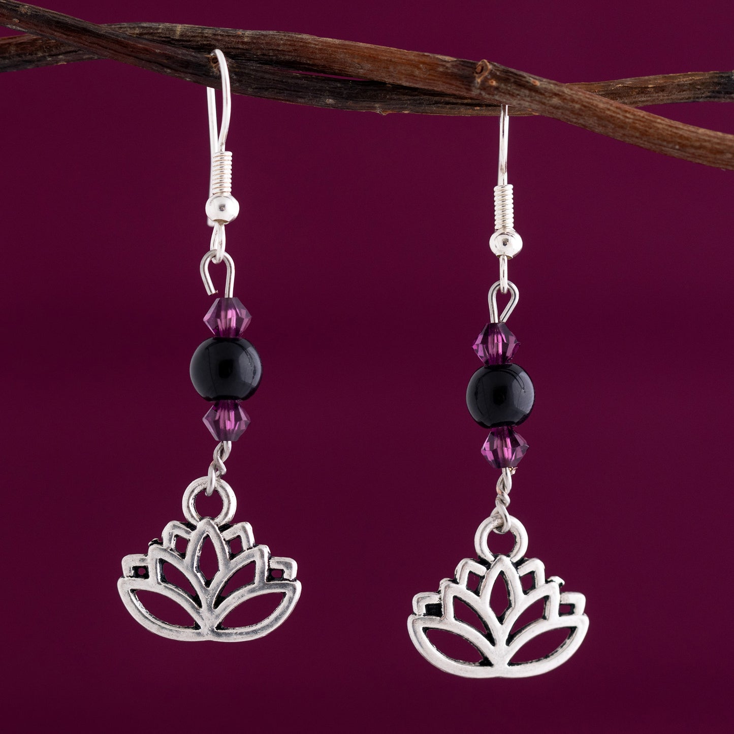Each gorgeous handmade pair of earrings is adorned with a captivating dark amethyst bead, shimmering purple glass crystals, and a delicate silver lotus charm. Handcrafted with precision and care in Haiti, each pair is a testament to artisanal skill and fair trade principles, ensuring both beauty and integrity in your accessory choice. Embrace elegance with a touch of global flair, knowing your purchase empowers artisans and communities alike.