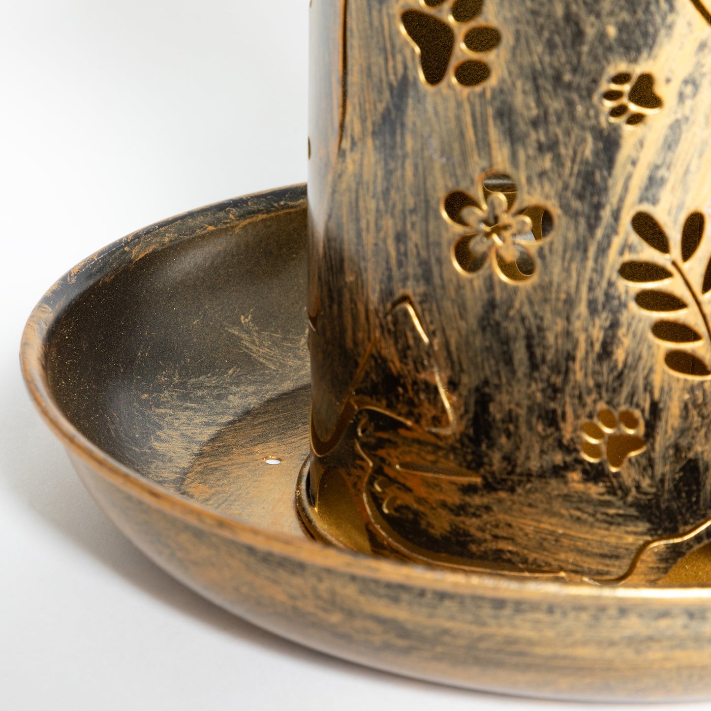 Illuminate your garden with whimsical charm using our solar-powered bird feeder, adorned with a delightful cutout design of your favorite furry friend - a playful dog or a serene cat, surrounded by blooming flowers. Crafted in a lustrous brushed gold hue, this feeder adds a touch of elegance to your outdoor space while providing a haven for feathered friends. As the sun sets, watch in awe as the built-in solar panel charges during the day, casting a gentle glow through the intricate cutouts, creating a mesmerizing display that brings joy to both humans and wildlife alike.
