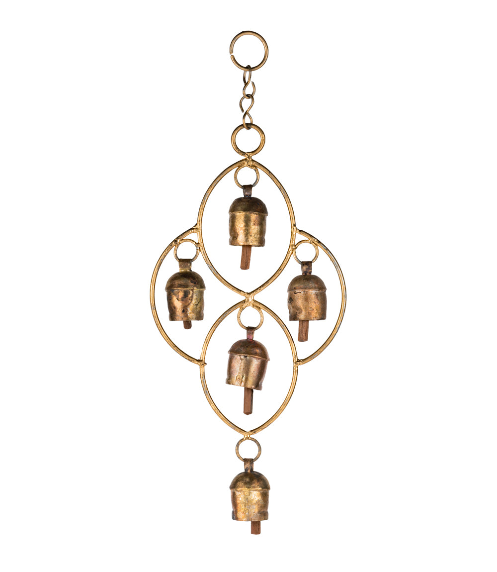 Upcycled metal hanging bell chime displays five handcrafted copper bells in a quatrefoil design. Add whimsy and charm to your home or garden!