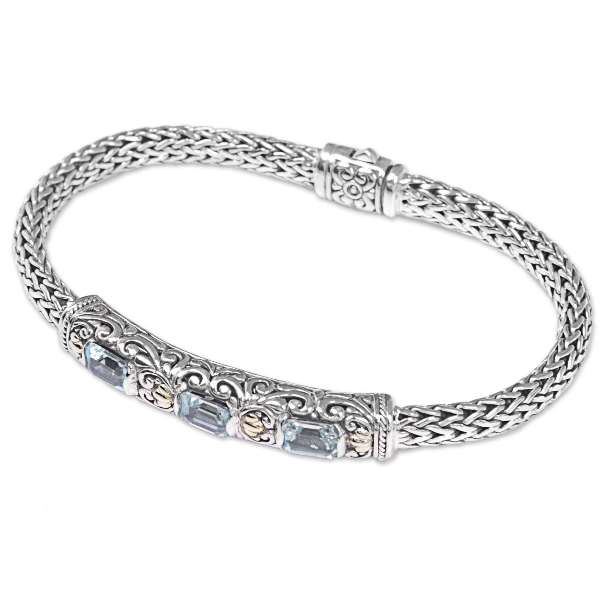 The crown of this regal chain bracelet features floral designs accented with gold vermeil. Blue topaz gems are secured in an naga chain, handcrafted by Wayan Neri.