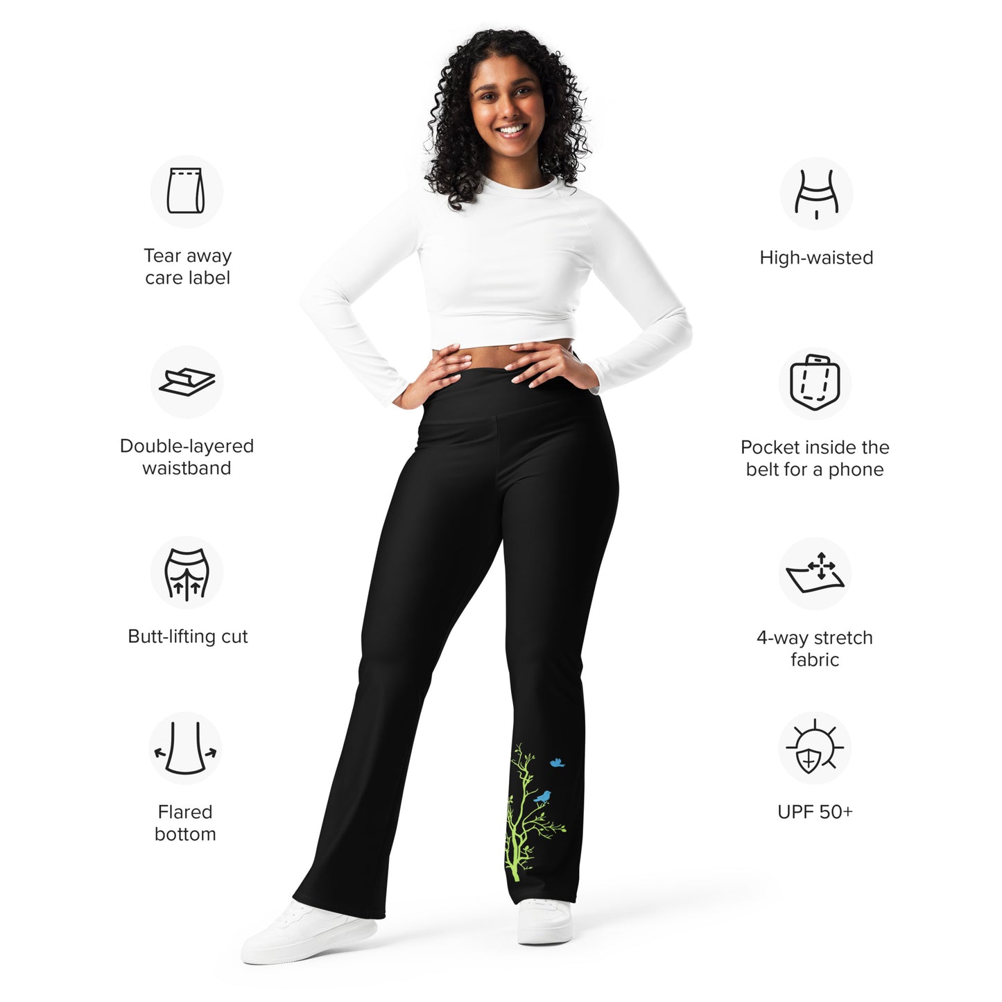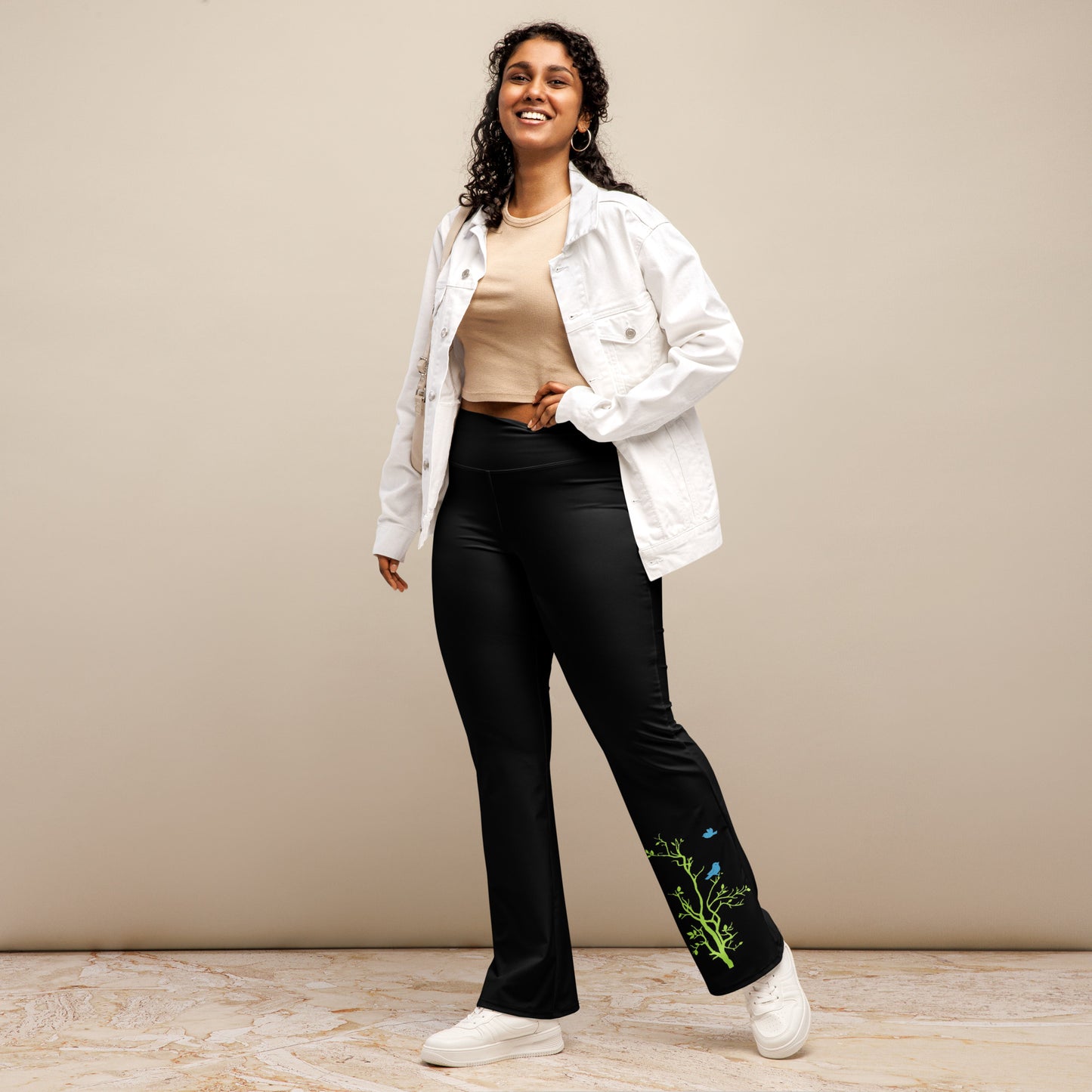 Designed to enhance your figure, these trendy leggings feature a high waist and a butt-lifting cut. The flared leg bottoms add a touch of style and make the leggings comfortable. The leggings feature two sweet birds having fun on a a branch.