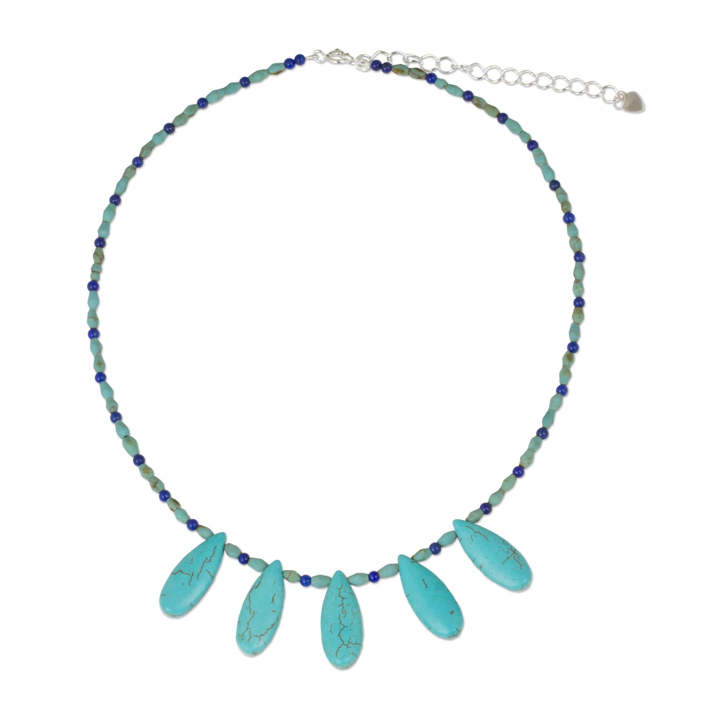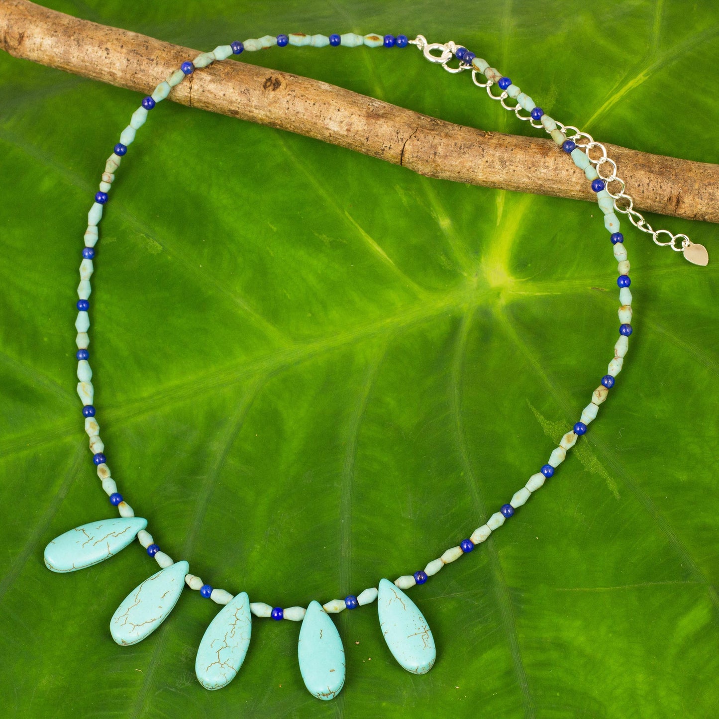 Simply delightful, this necklace is by Thai artisan Somluck Komolmith. She crafts the beaded necklace by hand, balancing the intense blue glow of lapis lazuli with the lighter turquoise shade of dyed calcite.