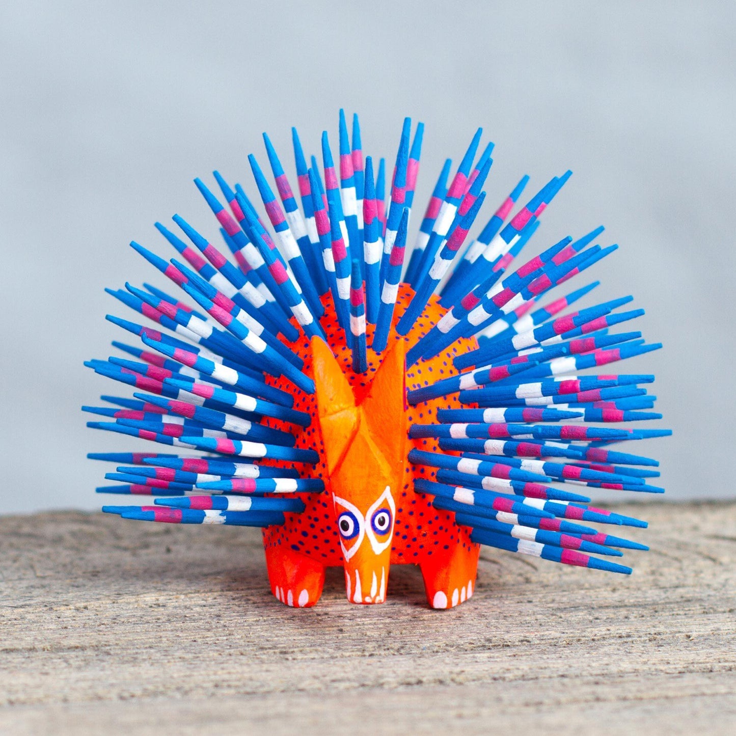 Zeny and Reyna use copal wood and maguey fibers to craft this adorable porcupine sculpture. Vibrant motifs in red and blue decorate the statuette.