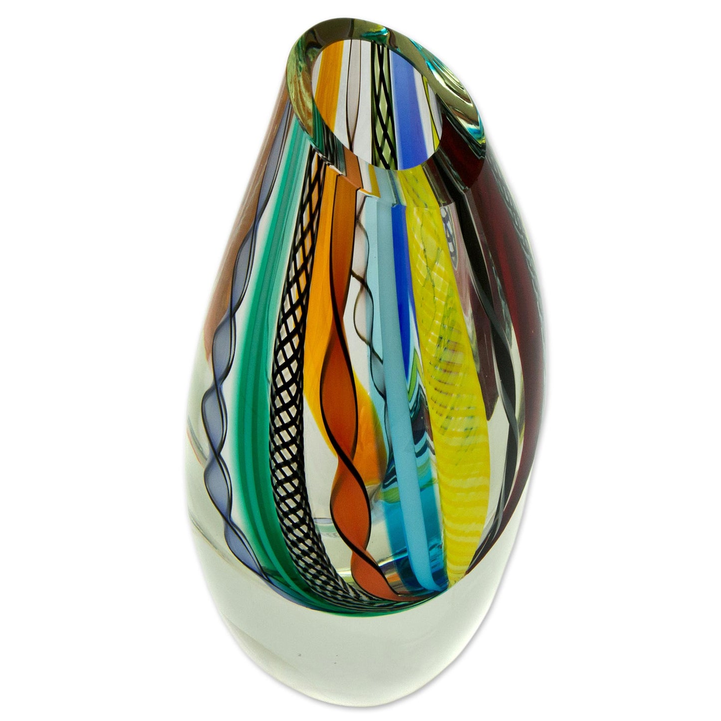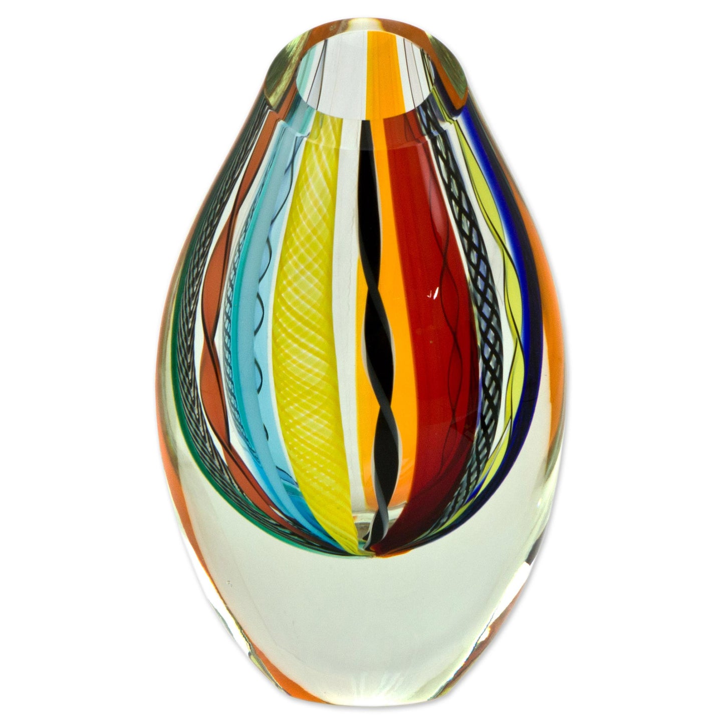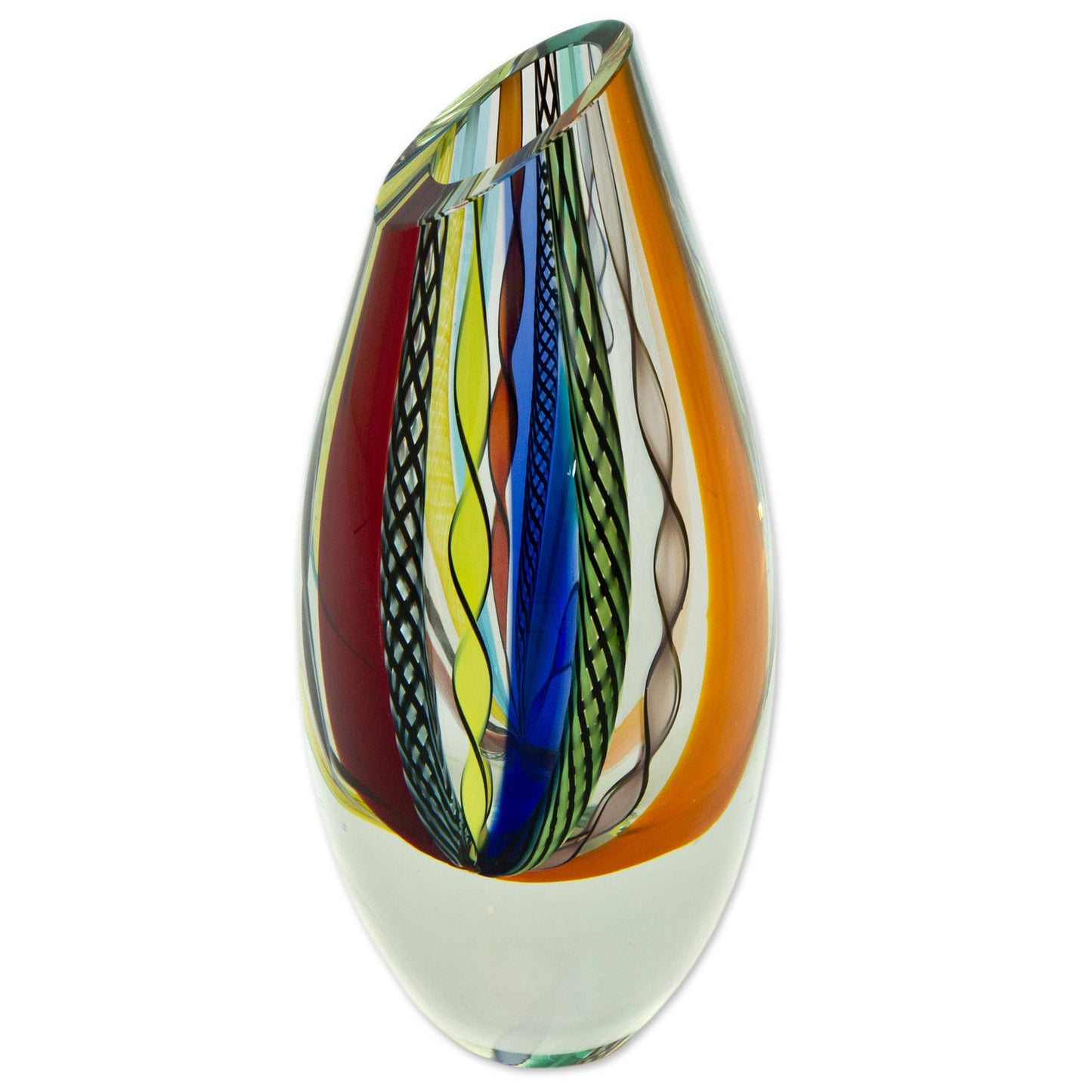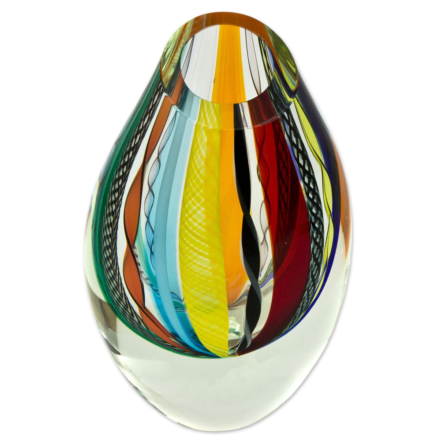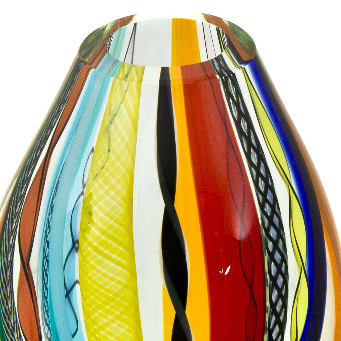 Covering a crystalline vase with a spectrum of color, the Seguso Family creates a joyous design of sunshine yellow, ocean blue and rain forest green that dance with orange and scarlet in a riot of festive patterns. They work in the age-old techniques of Murano glass brought from Italy to Brazil by Mario Seguso in 1954.