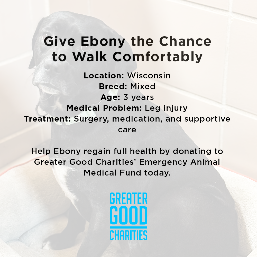 Update: Ebony received the essential surgery and is doing well in recovery. She is on the road to recovery thanks to your support. She will begin physical therapy soon and after that will go on to find a loving home.