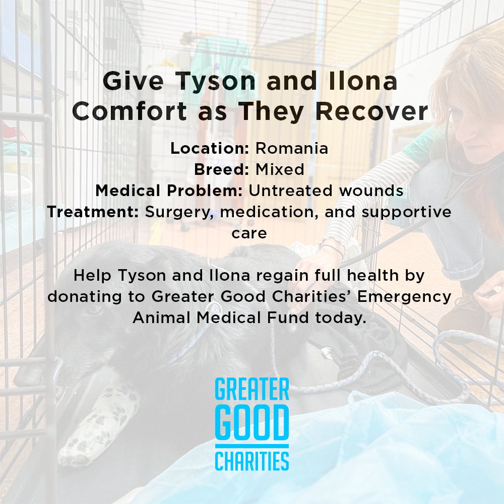 Ilona and Tyson were both rescued from a rural area in Romania with several injuries. Ilona was found with a severely infected wound caused by a deeply embedded string wrapped around her neck, while Tyson had been hit by a car and suffered a leg injury. Both dogs were rushed to the vet for immediate care.