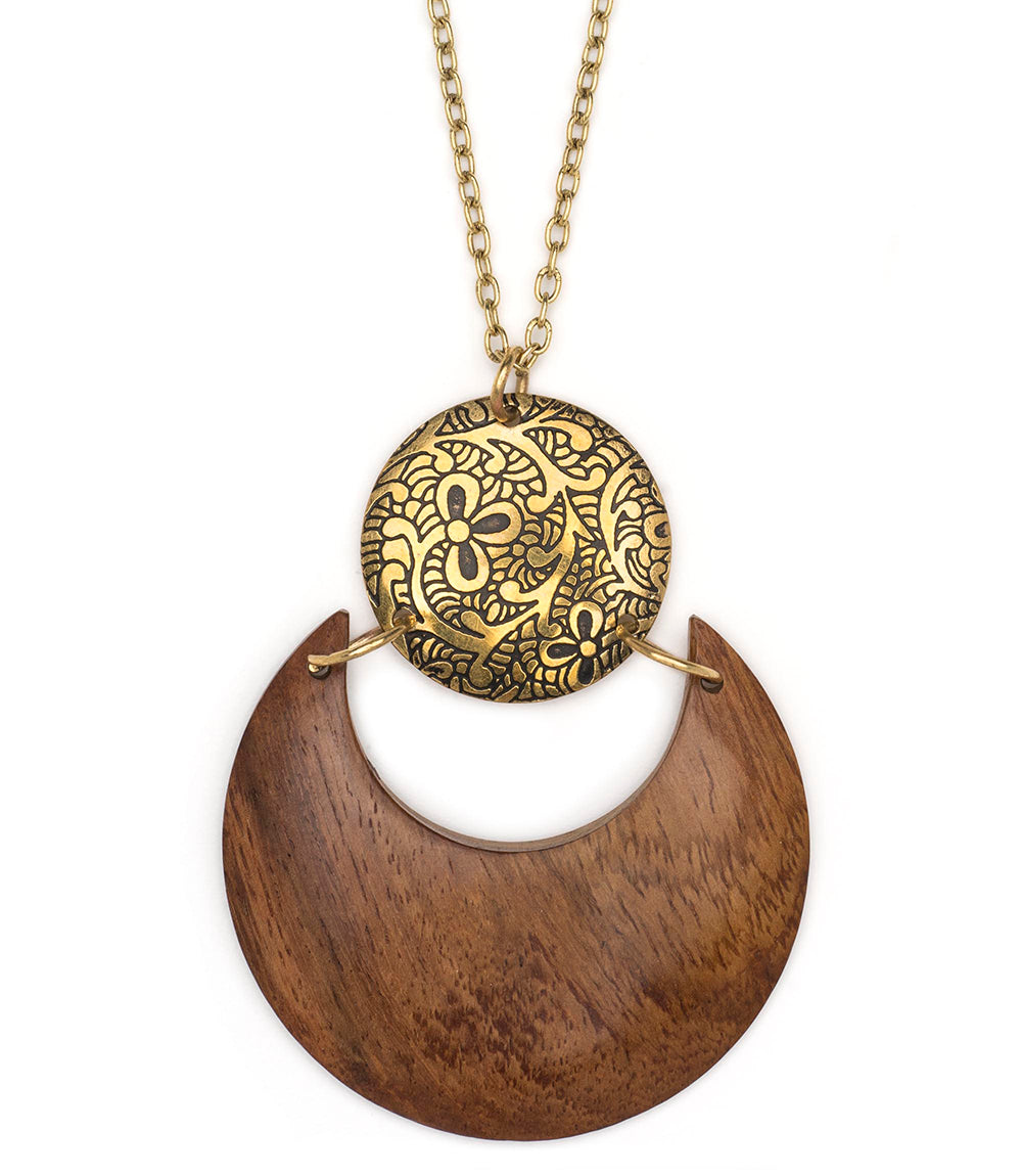 A beautiful, on trend addition to our gold and wooden Earth and Fire collection. This long brilliant necklace with golden brass etchings with a floral design, connected to a wooden piece on a brass chain is a wonderful statement piece.