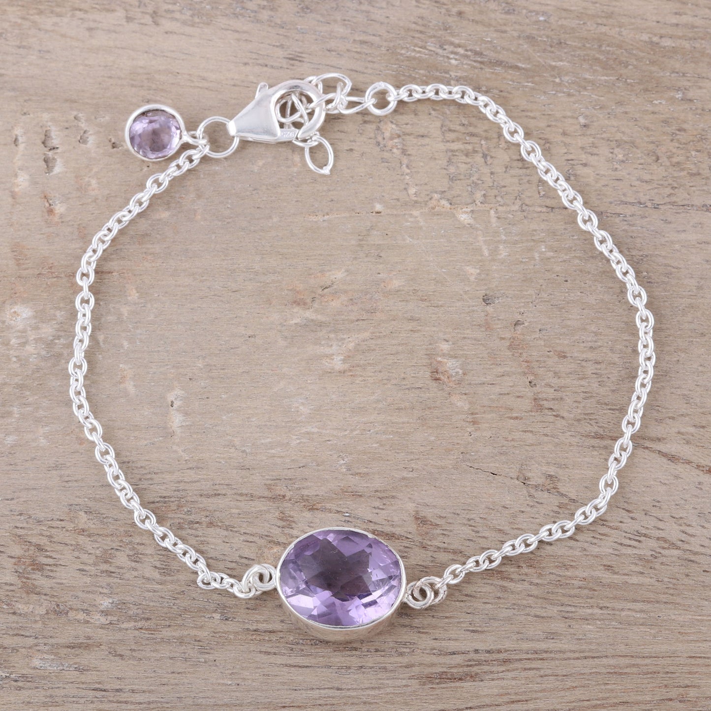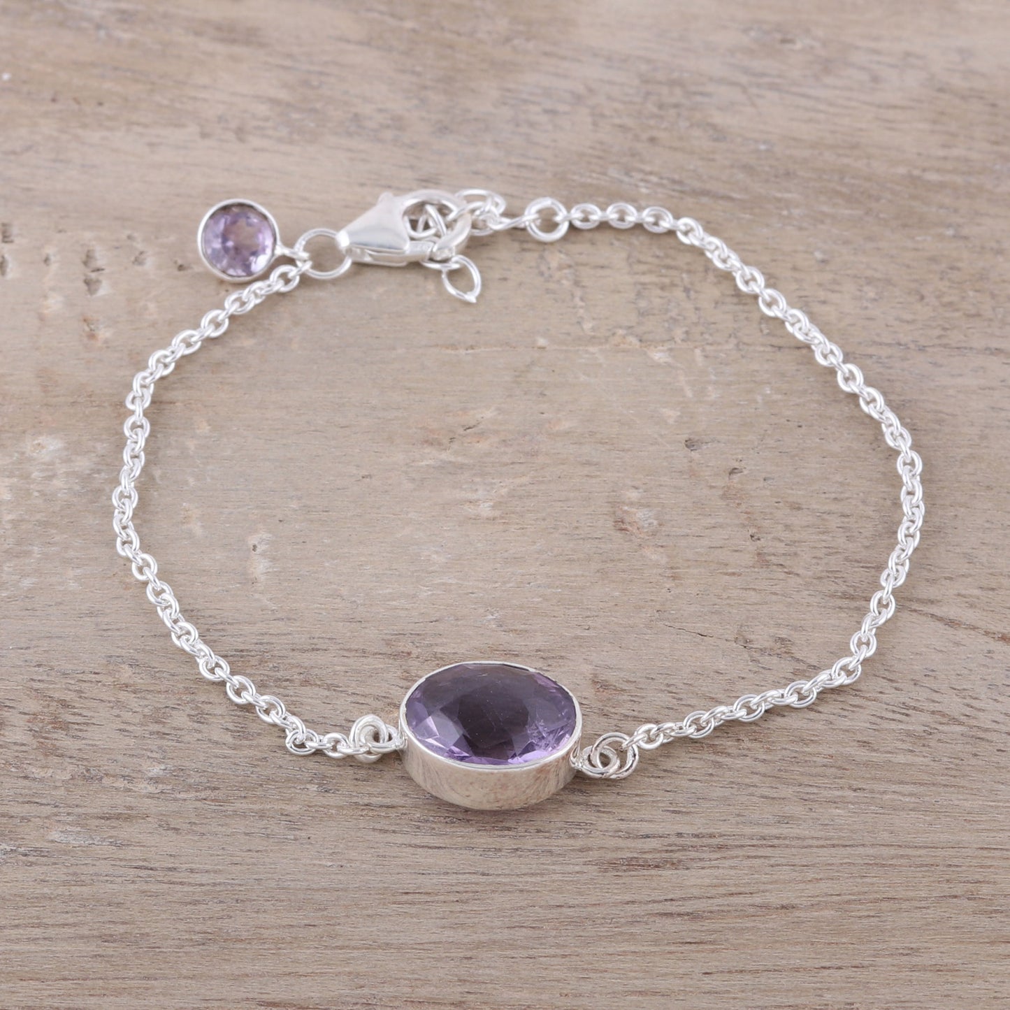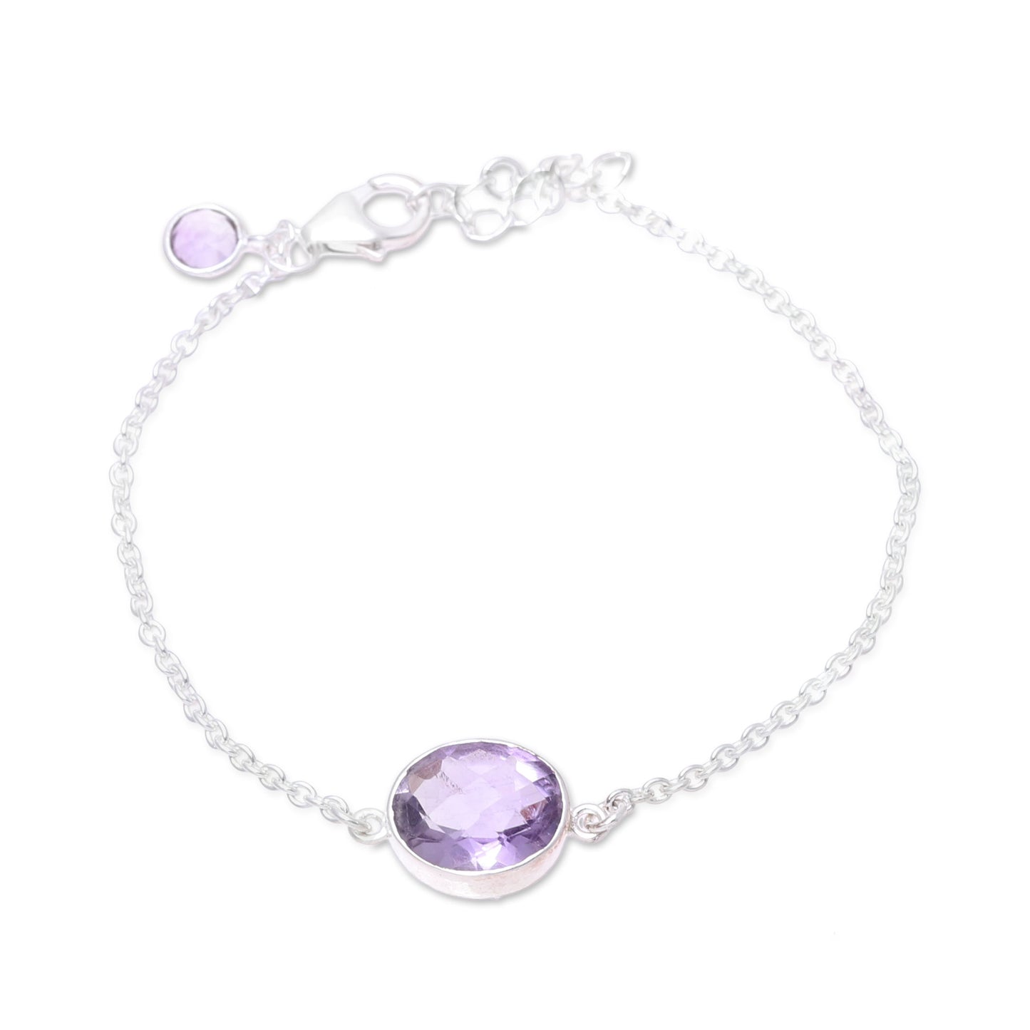 Weighing an impressive five carats, a single amethyst gemstone sparkles at the center of this fashionable pendant bracelet from India. Designed by Neetu Barathi, the bracelet is crafted by local artisans, who use sterling silver cable chain. A smaller amethyst gem forms a charm at the clasp.