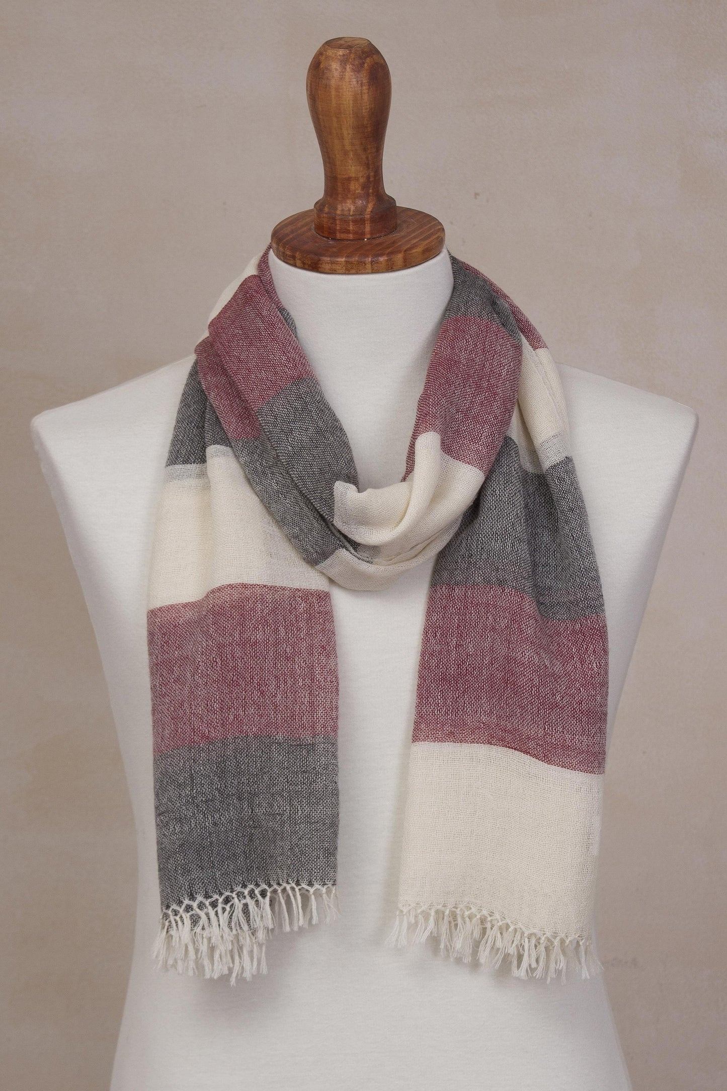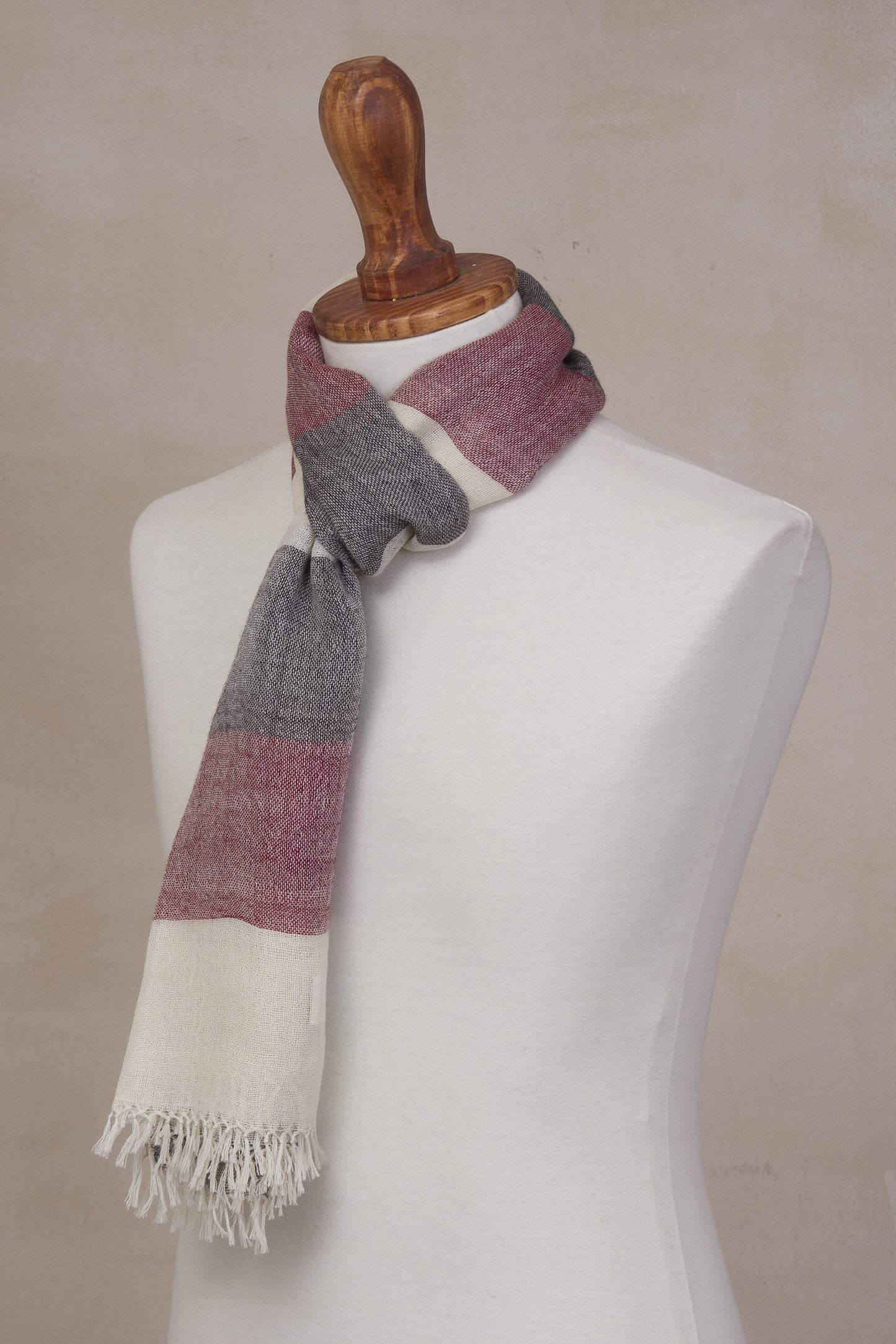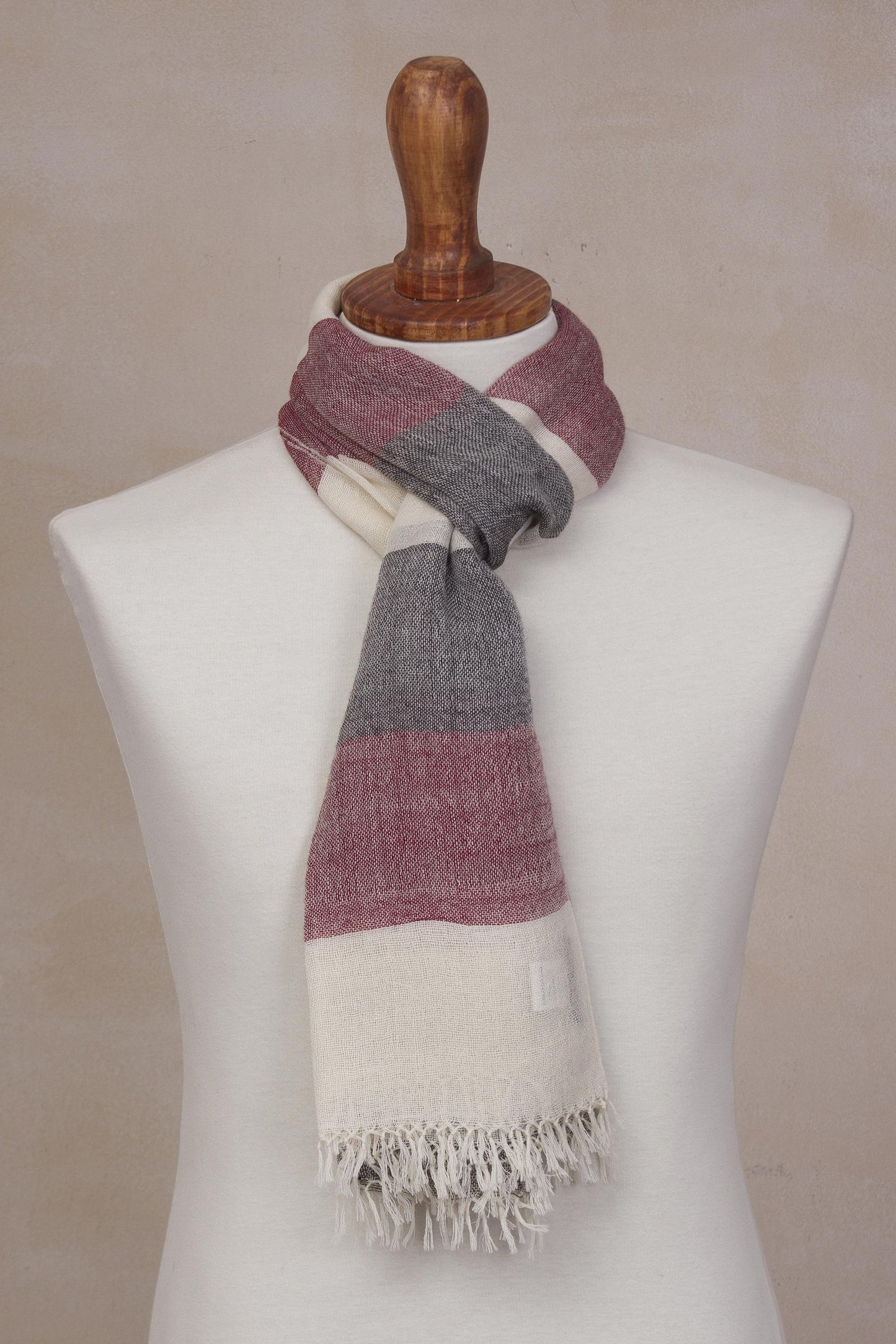 This luxuriously soft 100% alpaca woven scarf by Stefano Basso of Peru has the rich colors of your favorite cabernet. In broad stripes of ruby red, off white, and soft black, the trendy fashion accessory is finished with fringe.