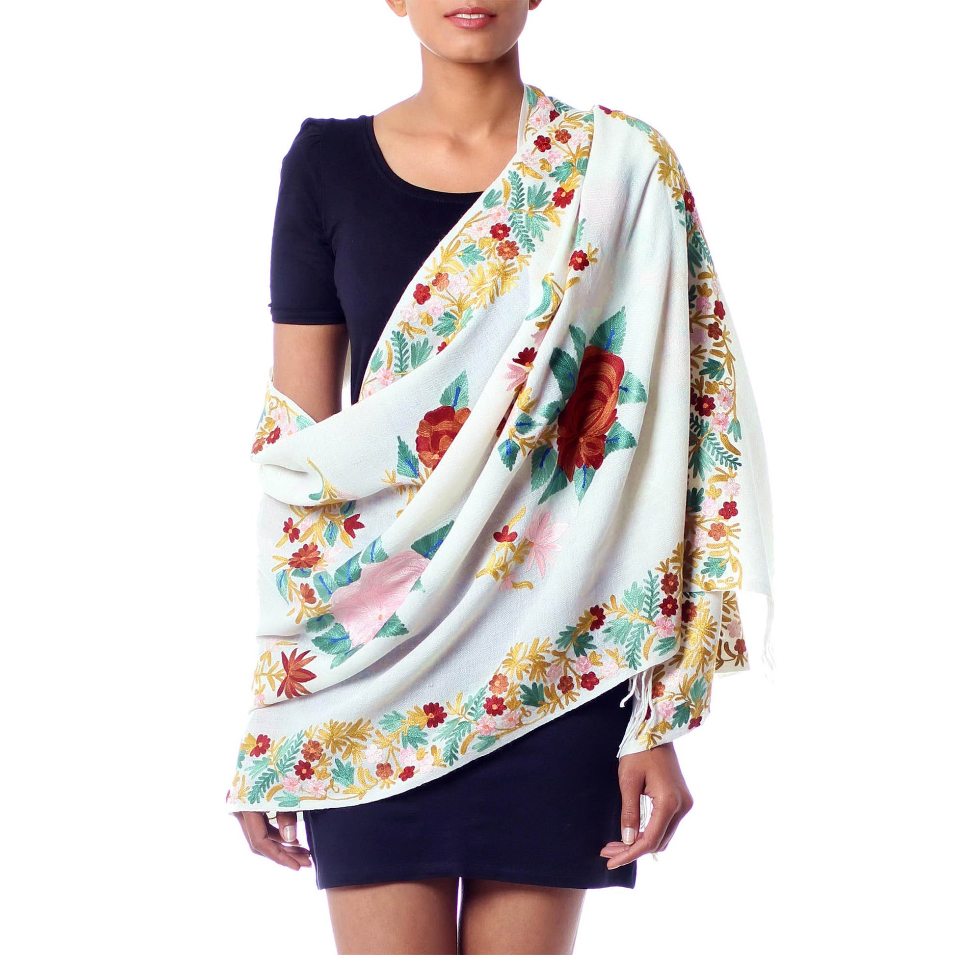 Creating a floral daydream, blossoms border a hand-loomed shawl from Syed Izaz Hussein. The motifs are a superb example of fine aari embroidery, which resembles a chain stitch.