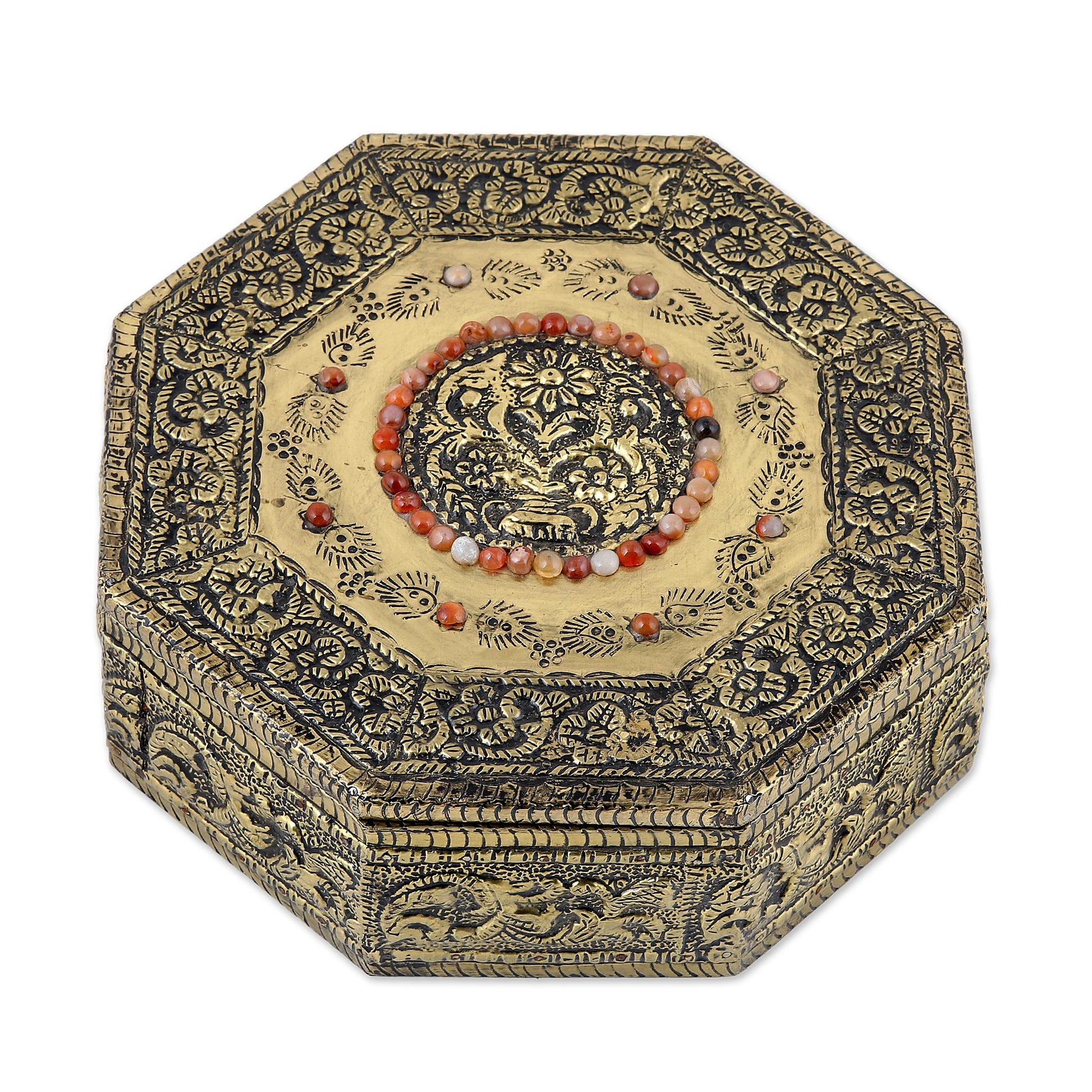 A circular medallion with colorful glass 'gemstones' centers this handsome jewelry box. Khalid Ali's design is octagonal in shape and features four velvet-lined compartments inside. Ali works in beautiful embossed brass to create the antique-style coffer. A mirror is conveniently placed inside the lid.